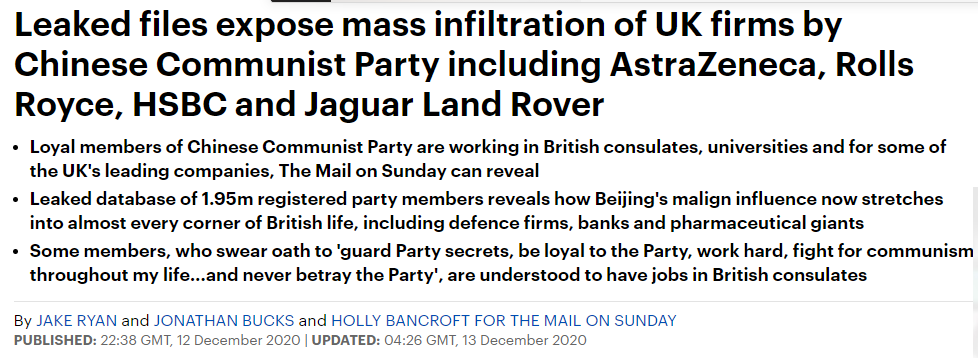同样的,也是一周前,美国国家情报总监下属的反间谍与安全中心主任伊凡尼纳称,中国情报人员已盯上拜登团队高层。他说,他的团队将会热心地向拜登政府作出简报,通报中国会如何展开情报活动。 把这些动作连起来看,再考虑到英澳与美国同为五眼联盟成员,就很有一种“美国大哥打头、其他小弟跟上”的感觉。 还有学者解读说,这些反华势力此时继续大肆炒作“中国间谍”论调,与美国当前政权交替的大环境有关。 他们希望影响拜登政府的对华政策,将其对华政策中可能的灵活性全部关上,进而直接造成美国等西方国家和中国之间的对撞态势。 西方媒体和反华政客这轮炒作,还有一个突出特点,就是进一步试图污名化全部中-共党员,硬生生地要把“所有中-共党员都是间谍”这一说法坐实。 他们手头的证据,就是从这份所谓的泄密文件中发现,在一些外国驻华领事馆以及国际企业里,都曾有过身为中-共党员的工作人员。 澳大利亚一个情报官员甚至直言:“任何被允许在外国使馆或领事馆工作的中-共成员都是潜在的间谍”。 额......这样的政客和说辞,真是让人无语。 建党99年来,中国共-产-党从当初50名党员发展到现在的9200多万党员,这是一个值得自豪的身份。是党员,但同时也都是在各个职业和岗位上勤恳工作的“普通人”。这些职业和岗位,自然也包括公开在华招聘的外国领事机构以及跨国公司。 而党员身份,更多的是提醒和要求他们在工作和生活等各方面争当先进,以更出色的表现服务这个社会。 进入中国的外国机构和企业,都该心里明镜似地了解中国这个“基本国情”,就是中-共与中国融为一体不可分割,中-共党员中很多人都是在普普通通的工作岗位上,但他们又是这个社会中追求上进和优秀的突出群体。 在这个逻辑中,中-共党员跟“间谍”扯不上任何一点关系。 但这些西方媒体和反华政客要么是无知,要么就是揣着明白装糊涂。它们查了一下所谓在华外国企业一共招聘了多少党员,结果“一查吓了一跳”:“竟然”有数百名中-共党员不仅在相关跨国公司,甚至还在其中的一些“敏感机构”任职,比如汇丰和渣打银行、制药巨头辉瑞和阿斯利康公司以及空客、波音和劳斯莱斯等具有国防工业利益的公司。 那更不得了了!英国的一个前外交官大声叫嚣:“这些人就是中-共打入我们西方的楔子啊!” 且不说这些跨国公司或机构在招聘时从未禁止录取中-共党员,澳新银行的一位发言人还表示,该行不干预其员工参与政治团体的活动。 而且——就连澳媒自己都承认——目前没有证据表明这份所谓泄密文件中有任何党员为中国政府从事间谍活动。 既然没证据,几家西方媒体就将中国员工在外企或外国机构里工作,称之为“渗透”,仅仅凭借“党员”身份就给他们打上“间谍”标签,这得有多蛮横啊?!