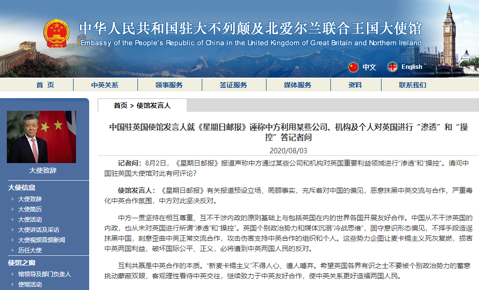 中国驻英大使馆:中国从未对英国进行所谓“渗透”和“操控”