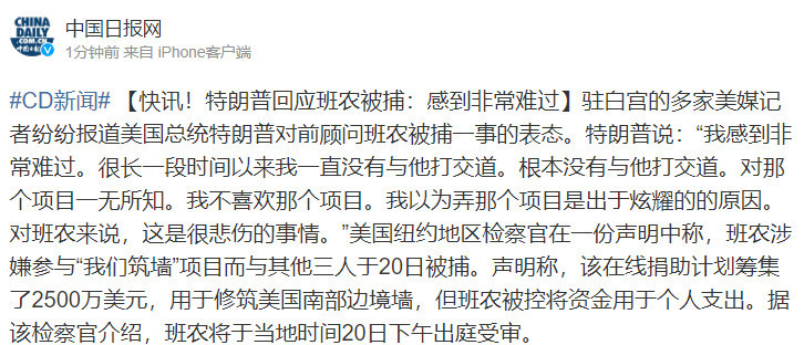 美国总统特朗普的前首席战略师史蒂夫 班农当地时间20日在美国纽约被捕,他被指控利用名为“我们筑墙”的众筹项目欺骗大量捐款人,并为其个人敛财。多位接受《环球时报》记者采访的美国问题专家均认为,这一事件与即将到来的美国大选存在联系,随着案情进一步发酵,其可能会产生不亚于“水门事件”的政治杀伤力,为选举再添变数。 美国《野兽日报》20日援引纽约南区代理联邦检察官奥黛丽·施特劳斯在一份声明中的指控称,班农与退伍军人布赖恩·科尔法奇、安德鲁·巴多拉托、曾为“布赖特巴特新闻”撰稿的蒂莫西·谢伊等人于“我们筑墙”项目中收到了2500万美元的捐款,“骗取了数十万捐款者的钱财,并谎称所有这些钱都将用于建设边境墙。”据美国全国广播公司新闻网(NBC)报道,“我们建墙”的众筹始于2018年底,旨在直接从公众处筹集资金,以在国会的反对下修建特朗普竞选承诺中的美墨边境墙。 NBC称,这一项目的负责人科尔法奇此前声称,他不会从中获取酬劳,且募集的资金将全部用于修建边境墙,但起诉书显示,他实际从捐款中拿取了超过35万美元用于私人用途,并对此采取措施隐瞒。此外,起诉书表示,班农控制的一家非营利机构从捐款中收到了100万美元,其中一些用于支付他的各种个人开支。美国Axios新闻网则进一步报道称,这些钱被班农等人“用于各种个人开支,包括旅游、酒店、消费品和偿还个人信用卡债务等”。 起诉书还显示,去年10月,班农等人发现他们的众筹项目可能正在遭到联邦调查后,曾采取措施进一步隐瞒自己的行为,包括使用加密消息。 班农是特朗普2016年竞选团队中第二名面临刑事指控的竞选经理。2018年,特朗普前竞选经理马纳福特被判欺诈罪。据报道,班农预计在20日晚些时候在纽约联邦法院出庭,他与其他3人各面临串谋电信诈骗和串谋洗钱的指控,每项罪名最高可判处20年监禁。 特朗普20日在被问及前顾问班农被捕一事时表示,“我已经有很长一段时间没有和他打交道了。对班农先生来说,这是件可悲的事情,也令人惊讶。我不喜欢那个项目。” 白宫战略传播总监艾莉莎·法拉则拒绝对此事作出任何回应。 在2016年的总统大选中,班农曾出任特朗普竞选团队主管,被视为后者的重要智囊。2017年,班农在特朗普政府中出任白宫首席战略师、总统高级顾问。同年8月,特朗普解除了班农的首席战略师职位。班农曾作为联合创始人担任过剑桥分析公司副总裁,这家公司后来卷入了滥用社交平台脸谱公司数据影响2016年美国总统选举的丑闻,同时,他也是极右网站“布赖特巴特新闻”的创立者,还是一名白人至上的种族主义者。 在中国,班农被人们称为“偏执疯狂的冷战活化石”,因为他对中国的态度已经不能用普通的敌意来形容,简直可以说是歇斯底里甚至是癫狂。他曾声称中美贸易争端是“根本冲突”,也曾叫嚣要把中国“打回到第三世界”。 社科院美国研究所研究员吕祥20日接受《环球时报》记者采访时分析称,通过种种情况看,班农很可能存在问题,他日常各种活动花销巨大,但缺少收入来源,这样的财务状况决定了班农很可能通过不法途径获取资金。 这位长期关注美国政治的学者认为,此次提起检控的地点位于纽约“丝毫不出意料”。吕祥表示,由于特朗普是纽约人,他和身边人大多数活动都在纽约,如果有违法行为也很可能发生在纽约。此外,纽约是“铁杆”民主党州,对特朗普的负面情绪很重,司法机关会受到此种因素影响。 同样是在纽约,该州总检察长本月6日起诉美国最大拥枪组织全国步枪协会,要求解散该协会。分析人士指出,这起诉讼由民主党掌控下的纽约州的民主党籍总检察长发起,针对的是共和党铁杆支持者组织。步枪协会也是美国影响力最大的游说集团之一,仅2016年就在政治活动中支出4.12亿美元。此案被认为是美国两党间的激烈博弈。 当前距离定于11月3日举行的美国总统大选还有75天,任何事件都可能影响选情走向。作为曾经帮助特朗普问鼎白宫的关键团队成员,此次对班农的检控也被认为与大选脱不开关系。外交学院国际关系研究所教授李海东20日接受《环球时报》记者采访时表示,班农被捕背后不排除有民主党“挖坑”,甚至共和党内部政治对手的操作。 吕祥也同样认为,这一事件与特朗普和目前的选情有着联系。吕祥表示,虽然班农已离开白宫,但与特朗普依然有着千丝万缕的联系,他也是白宫外特朗普最主要的支持者之一。因此,班农为边境墙的筹款也很可能是打着特朗普旗号进行的。 不过,由于目前纽约检方和美国媒体披露的信息依然较少,白宫等方面也未作出回应,班农被捕的“政治杀伤力”尚难以预计。中国人民大学国际关系学院副教授刁大明20日对《环球时报》记者表示,班农目前的所作所为可能不会把火直接引到特朗普身上来,但如果这有机会成为一个导火索,“通过班农有可能挖掘出更多后续,例如爆出2016年大选期间或特朗普就任初期一些不为人知的事”。 “由于现在美国社会是高度分裂的,对班农进行逮捕很可能会导致民粹主义的反弹”,中国人民大学国际关系学院副院长金灿荣20日告诉《环球时报》记者,班农有数以百万计的“粉丝”,他的追随者们很可能倾向于认为对他的逮捕是一个阴谋,白人保守民粹主义者们很可能会被激怒并做出激烈反应,从而给临近大选的美国政治