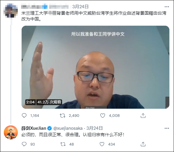 旅意台生“论文国籍写台湾”,大陆导师切中文说了段话