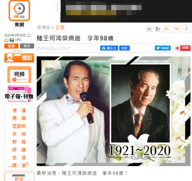 原标题:港媒:港澳知名爱国企业家何鸿燊逝世 享年98岁