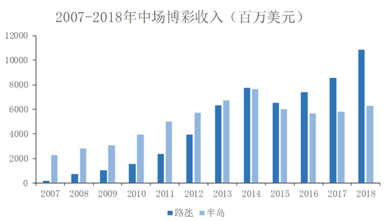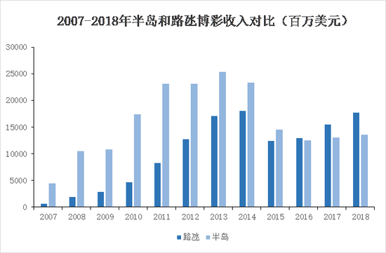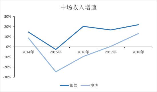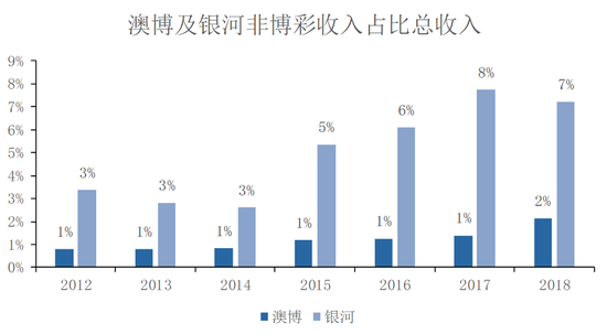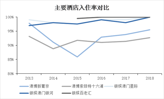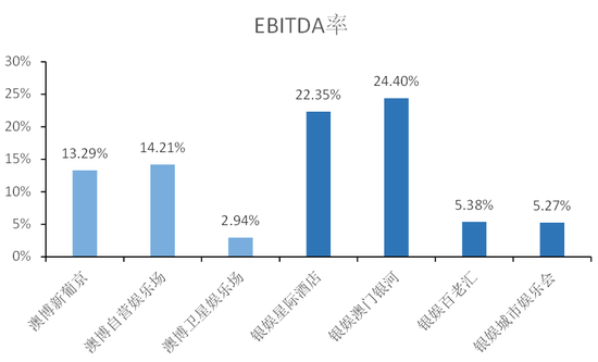 这些承包出去的赌台给企业带来的利润非常有限。 澳博的毛收入中,超过50%的部分来自卫星娱乐场,但与第三方合作的卫星娱乐场EBITDA通常低于自营娱乐场,因此澳博每年实际收入主要还是依赖旗下2007年建成的位于半岛的新葡京娱乐场。 而银娱的毛收入超过70%来自位于路氹新城的澳门银河,与第三方合作的城市娱乐会和自营的由金都娱乐会改建的百老汇占比很低,总和仅为3.59%。 ▼ 澳博和银娱各娱乐场 2018年EBITDA率对比