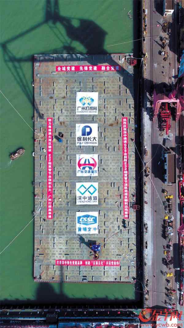 智能制造“最宽”隧道的“最宽”管节 深中通道是集“桥、岛、隧、水下互通”于一体的超级跨海通道。沉管隧道长约6.8 公里,是世界首例双向八车道钢壳混凝土沉管隧道。沉管隧道共由32 节管节组成, 国内没有可参考、借鉴的技术指标。 其中,作为世界最宽最长钢壳沉管隧道、深中通道中最宽的一个管节,S08 标E32 管节将沉放在深中通道的深圳侧,与东人工岛岛头堰筑段对接。 数据显示,E32 管节长123.8 米,宽由53.6 米逐渐变宽至55.46 米,高10.6 米,具有“超宽、变宽”技术特点,浇筑方量约25000 立方米。浇筑完成后的钢壳混凝土管节重约6.8 万吨,比今年6 月沉放在西人工岛的E1 管节还要重8000 吨。 深中通道S08 标由保利长大工程有限公司、广州打捞局组成联合体共同负责。深中通道S08 标项目党支部书记许益光介绍,除E32 超宽管节外,S08 标段内还有9 节“巨无霸”沉管。 如何形象形容E32 超宽变宽管节?深中通道S08 标保利长大项目经理吴旭东打了个形象比喻:E32 管节采用了“三明治”的复合结构———矩形双层钢壳+1.5 米厚的高流动自密实混凝土。同时,E32 管节重达68000 吨,意味着比6 万吨排水量的辽宁舰还重。 这样一个独一无二的钢壳“巨无霸三明治”, 也凝聚着近年来建设者自主研发和智能制造的先进成果。 吴旭东介绍,仅针对超宽管节用的自密实混凝土,就成立了技术科研专项小组,耗时2 年研制而成,混凝土质量寿命可达到百年。 同时,为满足大体积混凝土方量浇筑的需求,保利长大项目建设团队研发了智能浇筑成套设备与系统,利用物联网、大数据、BIM 等信息化技术,构建虚拟施工现场,将施工数据实时传输至智能浇筑设备,实现管节浇筑过程智能化施工。智能制造还缩短工期,比预计今年9 月出坞目标提前了一个多月。 4.5 小时“窗口期”配合潮位出坞 7 月25 日, 从上午10 时半开始,历时两个半小时,至下午1 时,“巨无霸三明治”E32 管节顺利完成出坞。此举不仅刷新了该船坞最大吨位、最深吃水的浮体出坞记录,也刷新了世界上超宽管节在受限水域的出坞纪录。 当“巨无霸三明治”管节预制完成时,摆在技术人员面前的第一道难题便是如何在场地受限的情况下完成出坞绞移动作。 与今年6 月中旬沉放的首节沉管不同,由于受限于场地因素,超宽变宽管节只能在广州南沙中船黄埔文冲船厂的唯一船坞内进行预制(包括混凝土浇筑)及一次舾装。 “出坞过程最浅处水深只有8.3米, 必须等待涨潮时2.6 米的潮位,才能确保管节和船坞设施的安全性,当天满足该潮位的持续时间仅有4 个半小时左右。”负责沉管出坞的广州打捞局项目经理孔维达表示。 出坞只是第一步,E32 管节需转运到港池内坐底寄放1 年。“如此大尺度的管节在半开阔海域的坐底寄放,在世界上尚属首例。”孔维达说,由于目前尚不具备沉放条件,寄放既是对制造水平的检验,更有利于后续沉管的制作。 深中通道管理中心岛隧工程管理部工程师席俊杰说, 按照计划,E32 管节将于明年年中,运至东人工岛岛头堰筑段进行沉放安装。预计2023年初完成S08标段内总共10 个“巨无霸”管节的安装工作。