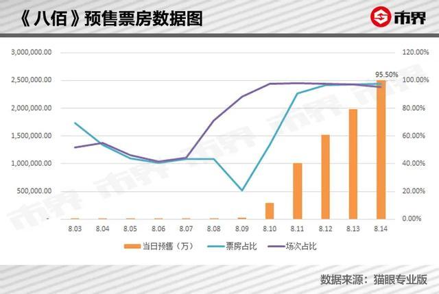 猫眼数据显示,仍处于预售期的《八佰》,截至8月14日凌晨12点,当日预售票房已经达到250.2万元,累计预售票房达到1457.4万元。 更重要的是,14日的票房占比和排片场次占比分别达到97.6%和95.5%,绝对的一家独大,在电影史上几乎没有出现过。 相比之下,即便是最近的一部高票房电影《哪吒之魔童降世》,整个上映期前,排片场次占比最高的7月31日,也只达到53.2%,几乎只有此次《八佰》的一半。 强势的场次占比下,华谊兄弟敲定了大中小影院的最终发行方式。 刚刚看完点映的Max告诉市界,这部片子给她的感觉是能够点燃一个人的民族情怀,化妆和特效方面的制作也很精良,可以说是国内战争片历史上的一个进步。但不足的是,部分画面过于血腥。 “国内电影还是需要在分级制度上有所进步。”Max补充说道。 从事影视制作的Eric也观看了点映,他的感觉是很热血、也很泪目,对该部电影的幕后有过了解的他,观后整体感觉高于期待。 但从票房角度来看,Max和Eric都表示,这部片子从题材上看可能不够“商业化”,在受众有限的情况下,票房难免吃亏,同时战争片也无法从广告植入上获得多少收益。 当下,在全国人民度过了一个并不容易的上半年后,或许更需要一部轻松的影片。 “千夫所指”为哪般? 8月14日的点映开始后,年票房在200万以下的影院需要决定,是否愿意为《八佰》付出上一年票房的3.5%,来支付保底发行费用。 这些影院在8月19日之前定会纠结不已。《八佰》能否如期在小影院上映,还是要看这几天片子的口碑以及宣发效果。 然而,华谊兄弟到底是把数千家小影院得罪了。 宁肯被“千夫所指”,也要改变发行方式,华谊兄弟到底图什么?市界致电华谊,截至发稿前尚未得到回复。 “为了能快速地回笼资金吧。”李想解释,“如果按照正常的分账方式,制片方一般要等影片上映后4-6个月,甚至一年的时间,才能拿到分账票房收入。” 而如今,规定里明确提出,影院必须得在8月19日前,付清保底金额,即华谊现在就能拿到这笔钱。 数据上看,200万元票房收入的小影院虽然贡献占比不大,但数量占比达到30%以上,大约有4200家。如果这部分影院老板都选择缴纳核定保底金,那么即使按照平均年票房收入100万元来算,也有1.47亿元的即时现金流。 此外,“如果影院没能达到7万元的收入,就需要自己贴钱。”张远解释,“但如果票房超过了7万元,还要给片方分账。” 显然,这是一种转嫁风险的行为,同时也被许多人解读为华谊兄弟的“自保”手段。 “类似于一种对赌协议,影院买完片子后,效果超过预期的话能够多拿钱,效果不好的话也跟制片方没有任何关系了。”李想说。 不论是为了转嫁票房风险,还是想要快速回笼资金,最终都源自于华谊兄弟在疫情下的困境和对资金的迫切需要。 在影视行业工作已8年的Max告诉市界,她身边从事电影行业的朋友,过去半年都太难了。 “不像我们做电视剧,还可以以网剧的形式发行,还能糊口、生活。但是电影行业真的太惨了,好几个月发不出工资的也有。” 专门给电影演员拍见组照的王青表示,过去半年他几乎接不到“私活”,不像过去每个月总能拍个三五单。如今,朋友圈里的电影演员大多干起了副业,有的干起了直播,有的做起了微商,还有的放飞自我,干脆去开民宿了。 而作为《八佰》出品方和主发行方的华谊兄弟,在《手机2》引出的税收风波后接连受挫,2018年和2019年分别亏损9.1亿元和40.23亿元。 2020年成为至关重要的一年,但在疫情打击下,华谊兄弟一季度仍以1.57亿元的亏损告终。