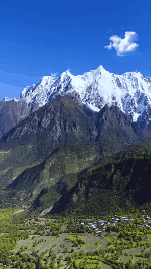 当你邂逅了米堆冰川, 你会惊奇世上竟有 这样罕见的自然奇观: 山上挂着冰洁如玉的冰川, 山下却有着翠绿郁葱的树林。