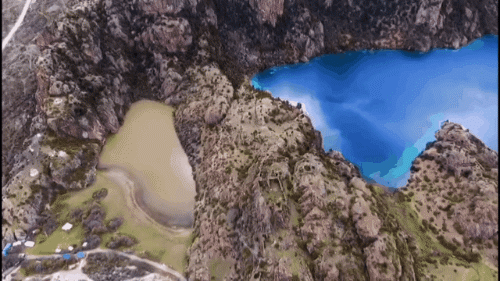 普玉三色湖, 站在岛山之巅俯瞰三色湖, 静谧的黄湖好似金甲匝地, 泛波的白湖宛若天宫银池, 而深邃的黑湖像一颗闪着幽光的宝石, 美得奇异而灵动。