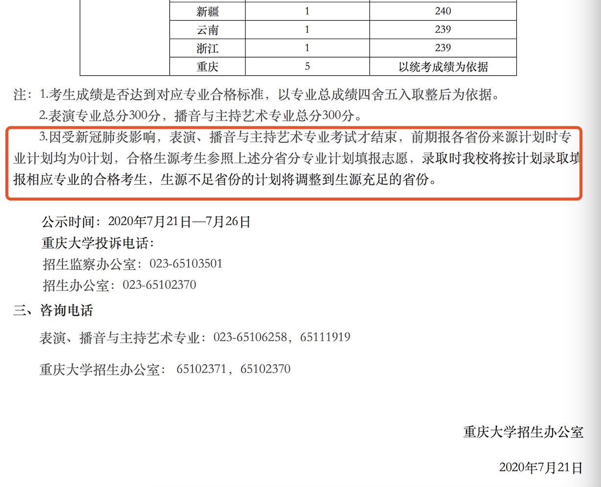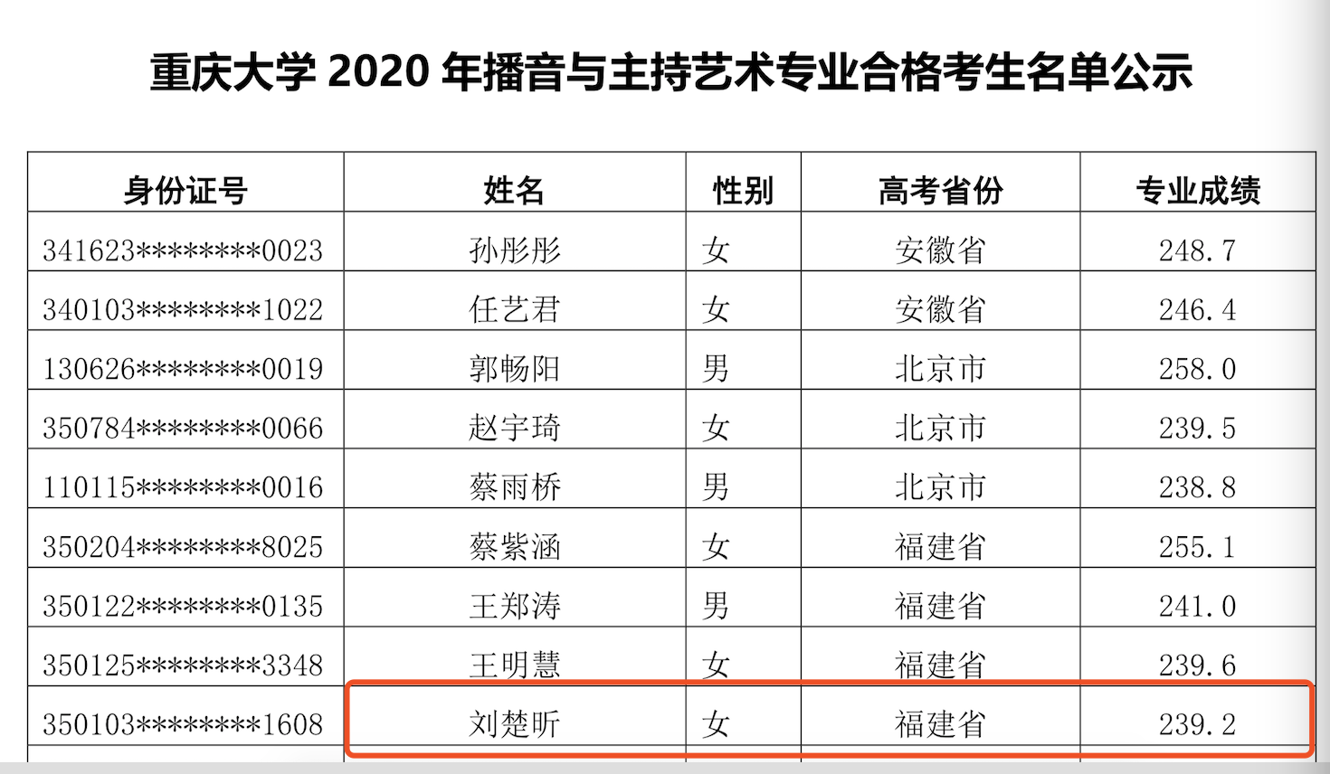 福建“一档多投”规则或存漏洞 8月10日下午3点,刘楚昕找到福建省教育考试院落实情况。教育考试院解释称:排名在刘楚昕前面的考生在“一档多投”过程中,同时被浙传及重大录取,随后预录取名单返回教育考试院时,由于其第一志愿填报浙传,故最终其被浙传录取,所以重大录空。 与大部分省份所实行的平行志愿“一档一投”不同,福建省艺术类本科提前批实行院校志愿“一档多投”。《2020年福建省普通高等学校招生录取实施办法》中解释了“一档多投”的具体操作规则:考生文考、省统考成绩均应达到相应省最低录取控制分数线,不受投档比例限制,按院校志愿全部投档。投档时,不对考生成绩进行排序,将符合投档条件的每一考生的电子档案同时投放到考生填报的所有院校。 8月12日,福建省教育考试院相关负责人向新京报记者解释称:福建省艺术类提前批是一档多投,考生可以报十几、二十个志愿,“假设你分数够高,这十几个学校都准备录取你,这个时候你的志愿顺序就起作用了,比如你一志愿报了中国美院,按照规则,你一定是被中国美院录取,后面的院校就跟你没关系了。” “这次投档中,第二名那个孩子比较厉害,同时被多个院校准备录取,但被第一志愿(浙江传媒学院)给录走了,这样他第二志愿重庆大学的名额就空出来,但空出来这个名额并没有专门留给福建,而是看全国联排。” 福建省教育考试院表示,重庆大学播音专业属于艺术类提前批,没有对每个省下招生指标,也没有给福建下任何一个招生计划,而是全国统招,看全国排名。“按照学校的录取规则,刘楚昕在填报重庆大学播音专业的全国考生排名中是排不上号的。” “现在的招生是非常公开透明的,我们完全是按照规则来的,那是很严密的一个程序。考试院方面是毫无瑕疵的。”福建省教育考试院相关负责人表示。 据悉,福建高考艺术提前批“一档多投”已施行十余年。知名高考志愿填报专家晨雾评价称,“一档多投”规则对高分考生较为有利,但低分考生如果被投档机会推后,同时考试院与高校之间协作不好,就会造成高校录空、稍微低分的合格考生被漏录。 重庆大学未向福建省考试院下达招生指标 专家对记者分析,除福建“一档多投”规则本身可能存在的漏洞外,导致刘楚昕未能被重庆大学录取的另一重要因素或为重庆大学播音专业录取规则为“全国统招”。 福建省教育考试院反复对记者表示,重庆大学没有给福建下任何招生计划,所以被按照统招学校对待。“不下计划就意味着全国统招,就要看全国排名录取。”福建省教育考试院表示,目前为止,重庆大学的播音专业没有在福建录取到任何一个学生。“他们的指标如何调配不是我们能够决定的。” 然而记者注意到,7月21日,重庆大学在官网公布了相应专业的分省计划,显示该校播音与主持艺术专业在福建省计划数为1个。 重庆大学到底是否向各省份考试院下达了招生计划呢?
