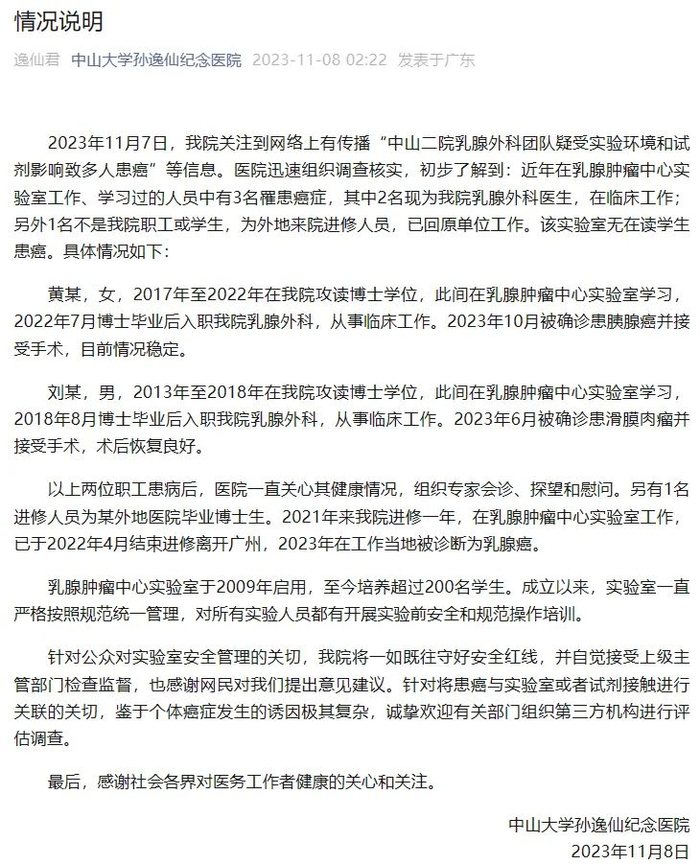 环境致癌物,包括阳光中的紫外线、环境中存在的高能辐射物(如氡气)和霉菌毒素等。紫外线是皮肤癌的主要诱因,氡气是除了烟草之外的肺癌的第二大诱因,食物霉变产生的黄曲霉毒素等是消化道肿瘤的重要致癌物。 生物致癌物,主要是能够改变人细胞基因的病毒,如人乳头瘤病毒(HPV)、Epstein-Barr(EB)病毒和乙型肝炎病毒等。 无论哪种致癌物,无论其致癌机制如何,最终都需要通过诱导改变人体细胞内的基因,然后经过前文提及的肿瘤发生、演变的步骤和过程,才能最终发展为可被检测到的肿瘤。 不同的致癌物根据与人体组织器官的接触方式可导致不同类型的癌症。并且,接触致癌物增加人患某些癌症的风险,并不意味着一定会让人患上癌症,有许多因素会影响接触致癌物的人最终是否会患上癌症,包括接触的剂量和持续时间、接触其它环境因素以及个人的遗传背景。 传言中涉及到的研究课题组负责人是中山大学乳腺癌研究中心主任,主要研究方向为乳腺癌的免疫治疗。了解上述癌症发生的知识,可以知道该课题组“六位不到30岁的年轻学者(学生)同时患有乳腺癌”的传言是经不住推敲的:目前已经确定的致癌物(包括研究中使用的致癌剂),无论可诱发哪些类型的癌症,都难以在短时间内发展为可检测到的恶性肿瘤;致癌物诱发的肿瘤更容易集中在消化系统、呼吸系统、皮肤和循环系统等容易和致癌物直接接触的部位,尽管不排除有些致癌物会增加乳腺癌的发病风险,但相对而言影响会低得多。