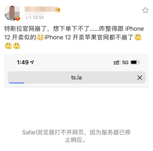 也有想“割韭菜”的网友 打开特斯拉的官网后发现 特斯拉的官网 像新款iPhone开卖时的苹果官网一样 崩了…… ↓↓↓