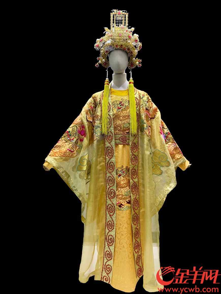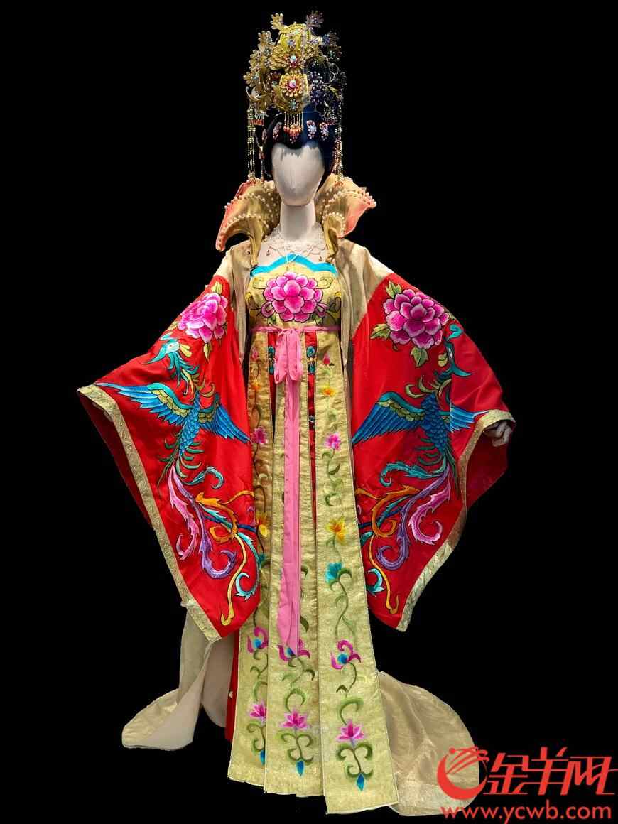 以参与了本月启动的 “岭南之窗”广州文旅融合创新示范区项目活动、正在广州塔东登塔口展出的两件大汉装为例。董惠兰介绍,大汉装是仿照汉代服饰加以美化的戏服,一般为宫廷贵族所穿,大袖,突显身份高贵,而这一套唐明皇与杨贵妃的“情侣大汉装”是为了大型实景历史舞剧《长恨歌》改良制作而成。“唐明皇的大汉装以黄色为主色调,内件用的是织锦绸布,绣有龙、祥云等,广绣手法使其颜色丰富、具有凹凸感,更加立体、逼真。杨贵妃的大汉装以黄色和红色为主色调,内件用的是织锦金布,以凤和牡丹为主要刺绣图案,为了突出杨贵妃人比花娇之美,采用了牡丹状的渐变粉色超高立领,饰以珍珠。”