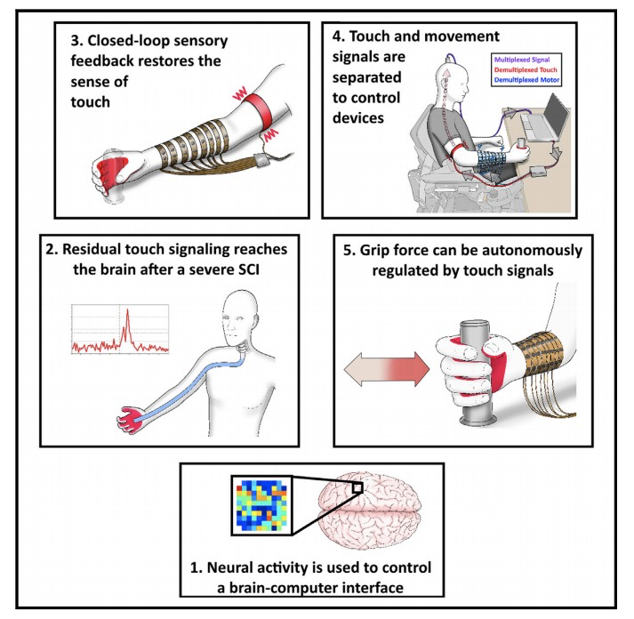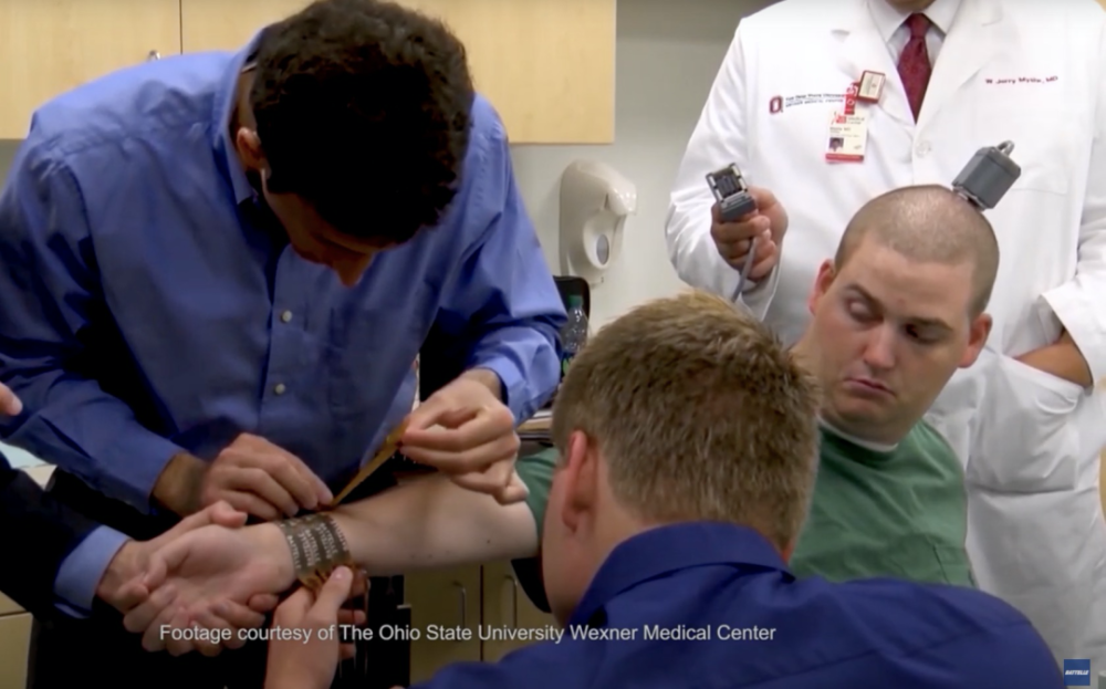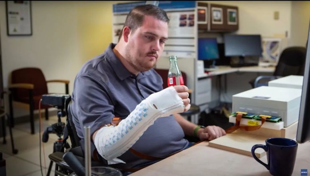 勇敢和持之以恒,终会得到回报 2010年,Burkhart 跳水导致完全脊柱损伤的同年,巴特尔纪念研究所开始设想一种全新的技术,名叫“神经旁路” (NeuroLife Neural Bypass Technology)。 他们希望借助一种近似于“读心”的方法,将瘫痪者的大脑活动通过电脑和算法翻译成信号,传输到安装在小臂上的义肢,刺激肌肉活动,从而恢复运动功能。 2014年,Burkhart 成为了该项目的第一个志愿者。 但其实在最初,他对动手术打开头颅,装一个小电脑进去的想法也感到很不可思议。 “我还记得跟家人说起这件事的时候,他们都认为这简直疯了。他们希望我别太着急,把一切都想清楚。当时的风险确实很大,如果手术出了问题的话,我在过去几年里复健的结果就都白费了。” 好在,他对巴特尔纪念研究所的团队有着充分的信心,并且相信他们发明的这个技术是有前景的。 整个实验进行到现在已经超过了五年。他每周都至少参与研究实验两到三次,每次都要持续数个小时不间断,他必须一直不停地配合实验的要求,费尽全力触摸、摆弄和移动物体,一次实验下来往往已经心力交瘁。 但团队成员发现 Burkhart 并不是一个会气馁的人。正相反,他每一次都比前一次更加投入。参与项目几年以后,现在做完一次实验的他就好像完全没有费任何力气一样。 这是因为,Burkhart 越来越享受这些实验的过程,并且充满了斗志。团队成员形容他就像是“拨了开关”一样,能够将一切情绪都抛诸脑后,立刻进入一种高度投入的状态。 他说,自己少年的时候一直很热爱运动(他现在还是当地一所高中的曲棍球队助理教练),享受那种专注的感觉,而且对于参与这个项目希望实现的目标非常有动力。