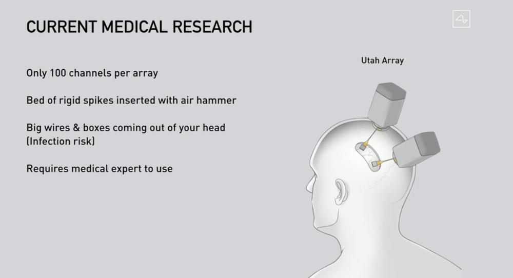 两大重要创新突破脑机科研瓶颈 当天马斯克所展示的Neuralink进展,无疑让人眼前一亮,仿佛未来科幻世界场景就在眼前,然而与脑机连接相关的科研并非由Neuralink独创,在业界也已经发展了多年之久。 正如Neuralink总裁Max Hodak在去年夏天的发布会上所说,“Neuralink并不是凭空产生,在这以前的学术研究已经有了很长的历史,从很大意义上来说,我们是站在了巨人的肩膀上。” Neuralink目前在该领域的主要贡献在于突破了之前脑机研究的部分瓶颈。根据Neuralink此前对外发布的研究论文中所述,脑机界面(Brain-machine interfaces, BMI)已经证明了具备在广泛的范围内帮助临床疾病的潜力,例如,研究者们已经展示了人类神经修复设备可以控制电脑鼠标指针、机械臂以及语音合成器等,而实现这些只需要不超过256个电极。 这些成功的事例证明了通过脑机接口在人脑和机器之间实现大量的信息交互传递完全是有可能的,但目前为止,BMI的研发受到无法记录大量神经元的限制,目前为止还没有临床上可用的能记录大量信息的微电极技术。 目前现有的两种方案都存在着不小的弊病,一种运用硬金属或半导体,但由于尺寸过大,在植入大脑时容易引发免疫反应,从而影响到设备的功能和长期使用,另一种运用极细的多电极聚合物管线,虽然体积小,但缺点是坚硬度不足,难以直接植入脑内。 所以针对上述现有技术方案的瓶颈,Neuralink进行了两项重大创新:运用超细的聚合物管线(解决植入物尺寸问题)和神经外科机器人(解决管线硬度不足难以植入的问题)。 目前,Neuralink已经可以做到在脑部28平方毫米的面积上,快速植入96根超细管线(每根管线直径为4-6纳米,大概人类头发的三分之一,包含32个电极),总共包含3072个电极,这一电极数量已经大大超出前文所述的256个电极数量。根据每分钟植入6根管线的速度来计算,也就是说完成全部96根管线植入总共仅需16分钟。 根据当天发布会现场Nerualink研究员的描述,由于神经外科机器人能够借助计算机视觉和镜像进行精准操作,96根极细的管线在植入大脑时,并不会破坏血管,大大降低对大脑的损害,Nerualink的研究员还提到,由于管线非常细,因此这些管线在植入后会随着大脑组织一起移动而并不会对大脑组织造成破坏。 Nerualink所展示的创新突破无疑是意义重大的,就目前业界已经实现的脑机接口应用成果来看,仅需不超过256个电极就能够实现一些基本的人机操控互动功能,而Nerualink能够提供多达3072个电极,可想而知未来能够实现的人机交互功能将会更多,从短期来看,Nerualink的目标是帮助一些有脑神经相关疾病的患者,包括帕金森、肌无力、癫痫等,让这些人群重新获得与周围环境互动的能力,更长期的目标则是更为广泛的认知功能的实现,包括移动、视觉、空间定位、语言、记忆甚至是数理逻辑等。