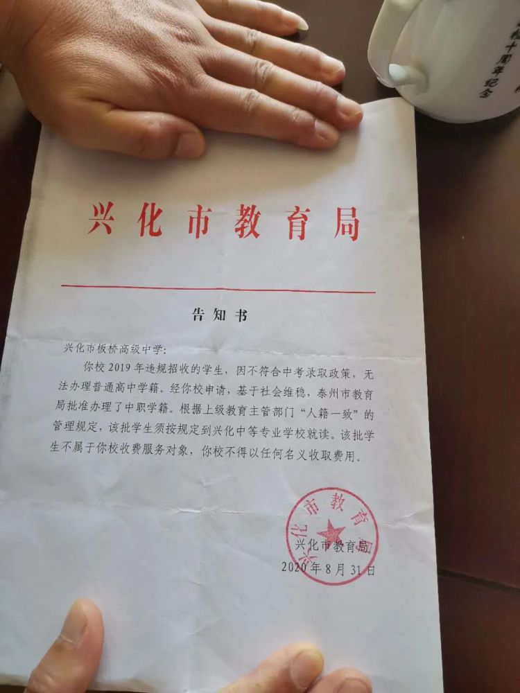 跨区考入民办高中 学籍“消失” 2019年7月,家住江苏泰州靖江市的江子翔以541分的成绩被兴化市板桥高级中学录取。孩子上高中,是全家高兴的事儿。 2019年12月,江子翔在报网课时不知道如何填写学籍,他和父亲江兴在咨询学校时意外得知,江子翔在板桥高中并没有获得普通高中学籍,入学以来一直处于无学籍状态。 学籍是学生属于某所学校的一种法律上的身份或资格,没有学籍,就意味着江子翔是学校的“黑户”。得知自己没有学籍后江子翔变得郁郁寡欢,有时候晚上一个人发呆,有时候还会哭。江兴介绍,儿子目前已读高二,学籍问题如果不解决的话,会影响到孩子的会考和高考。 资料显示,兴化板桥高级中学是 2003 年经江苏省兴化市人民政府批准改制的一所现代化民办学校,2010 年晋升为三星级高中。江兴介绍,“学校的资质是不错的,在泰州兴化,板桥高中是一所大家都知道的学校”。2019年7月,泰州教育网站招生简介明确提到兴化市板桥高级中学面向全泰州市招生。 江兴说,板桥高中去年的录取分数是486分,他看儿子江子翔的分数够了,就选择了去这所高中报了名。 江兴回忆,他到学校办理相关入学手续时收到了学校入学通知,每位学生也拿到学校加盖公章的注册回执单,回执单上明确写到:“两周内未办理入学手续,视为放弃高中学籍”。江兴认为,此回执单证明了学校对学生身份的承诺就是“高中学籍”。 在发现没有学籍后,江兴向学校、教育局各方寻求说法。他发现,和江子翔一样没有学籍的一共有38位学生。 泰州泰兴市的姚航也是这38人当中的一个。姚航妈妈介绍,初中时,姚航学习一直中等,中考时发挥得不太好,2019年6月26日上午10点,姚航查询了中考成绩——491分。 分数公布之前,姚航填报了泰兴市扬子江高级中学、泰兴市第二高级中学、板桥高级中学等四个志愿。但姚航的分数,没有达到泰州泰兴市的高中录取分数线(554分)。 6月26日下午两点左右,姚航和父母在教育局官网上看到了泰州平行招生计划。姚航母亲称,根据泰州市教育局公布的2019年全市学校招生简章,及泰州市2019年普通高中学校招生征求平行志愿计划,江苏省兴化市板桥高级中学面向全泰州市招生。 姚航和母亲查询发现,板桥高中的分数线是486分,姚航母亲认为,孩子的分数上板桥高中是足够的。姚航母亲称,看到平行招生计划后她直接到板桥高中去参加了现场报名,对方称可以入学。 6月29日,姚航母亲在板桥高中报名时交了一万九千元钱,其中四千元是学费,她从朋友那里打听到,另外一万五千元可能是私立学校的“建校费”。 姚航的初中位于泰州泰兴市,板桥高中位于泰州兴化市,姚航母亲称,在交钱之前她曾询问学校跨区生源是否可以取得学籍,“对方回复说学籍的事与家长没有关系,学校会弄好的”。得知能就读普通高中,姚航一家人都很高兴。 确认孩子能正常入学,姚航母亲没有犹疑就交了钱,“报名现场还有2、3个兴化本地的小孩在报名”。姚航妈妈回忆,报名的时候有回执单,但现在已找不到。 2019年8月21日,姚航参加了入学军训,此后一直正常上学。直到2019年12月,姚航母亲接到一位家长的电话,对方问她对孩子没有学籍的事情是否知情。姚航妈妈当时觉得,“这不可能”。 姚航父母到泰州教育局核实后,发现姚航确实没有学籍。“我心里一下子就凉到底了,像一盆凉水从头浇到脚。” 泰州市2019年高中招生征求平行志愿计划显示,兴化板桥高级中学面向全市招生