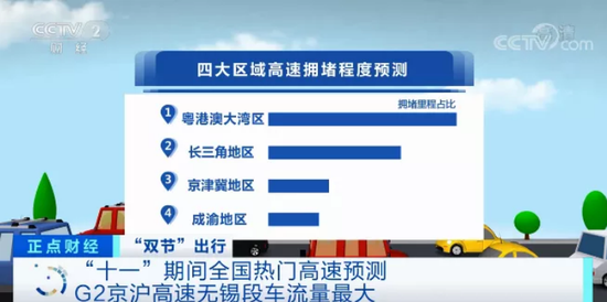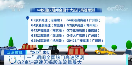 今年这些高速路段、景区最堵 G2京沪高速无锡段车流量最大 据央视财经,预计“十一”期间,全国十大热门高速主要分布在长三角地区和粤港澳大湾区,其中G2京沪高速(无锡段)车流量最大,其次为G4京港澳高速(广州段、东莞段)、G2京沪高速(苏州段)。