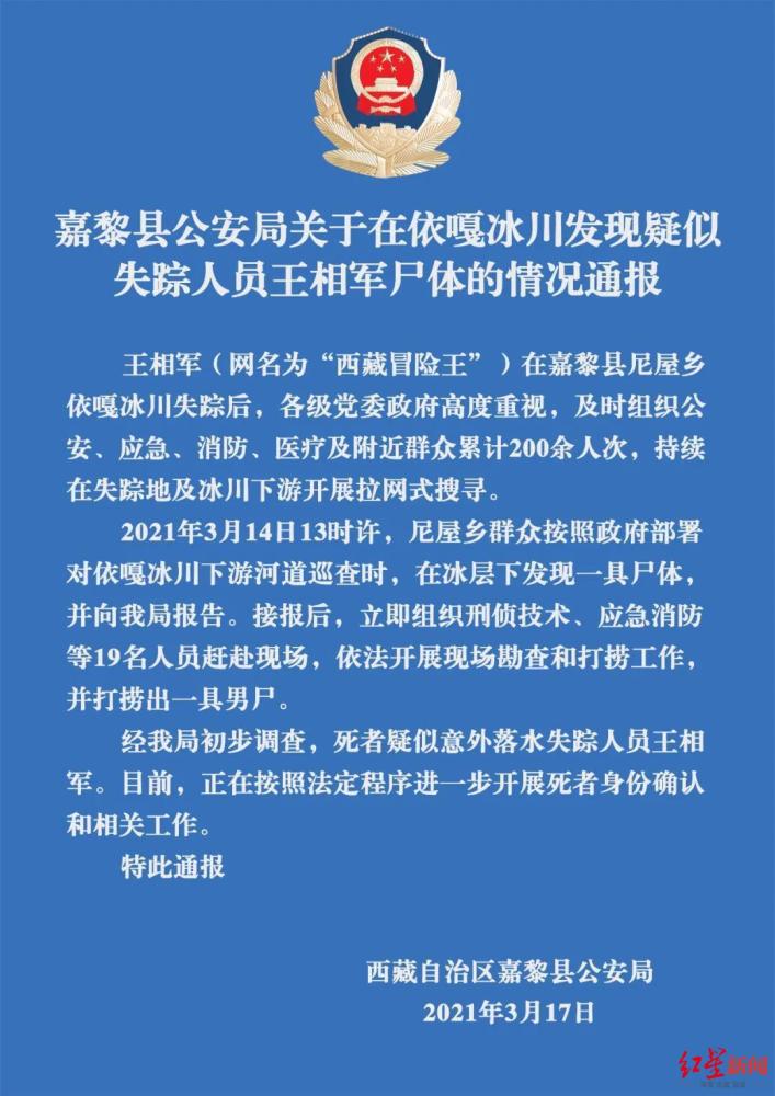 “流浪狗”网友:警方的通报为我洗冤了 1月22日,网上出现的“蓝洞”降噪视频中,“亚历山大流浪狗”和“小左”都与王相军同行,因此,这两人成了不少网友的众矢之的。有网友认为,“亚历山大流浪狗”有谋害王相军的可能,经网络传播发酵后,不少网友甚至直接认定“亚历山大流浪狗”就是“凶手”。 “王相军是我的朋友,人走了,我心里也难受……”不堪网暴,“亚历山大流浪狗”一直期待警方发布调查结果,希望所有谣言不攻自破——2月22日晚,他终于等到了警方发布的情况通报。 警方通报显示,2021年1月22日,网传经降噪处理的王相军“蓝洞”(冰洞)探险视频,质疑“王相军失踪系谋杀”。 警方依法调取了网传“蓝洞”降噪视频的原始视频,并送专业机构鉴定:“视频系王相军本人于2020年12月10日13时42分拍摄,声音主要有流水声、脚步声、衣物摩擦声、呼吸声等,未检测到有效语音”,视频拍摄地点位于西藏自治区林芝市波密县易贡乡恰青冰川,与王相军落水地依嘎冰川直线距离为115公里(乘车路线900多公里)。 “警方的通报为我洗冤了。”接到封面新闻记者回访电话时,“亚历山大流浪狗”难掩内心的激动,但情绪却非常糟糕。他称自己看到警方通报后,立即进行了转发,但没想到引来了新一轮的网暴,“这事儿还没完,似乎也完不了”。 “亚历山大流浪狗”称,春节前后,网友对他的网暴冷了下来,他难得过了几天清净日子。当他转发警方通报后,“很多被营销号带了节奏的网友,好像又有地方发泄情绪了,不相信我是清白的,仍然认为是我杀了王相军,甚至还有人质疑警方的调查”。