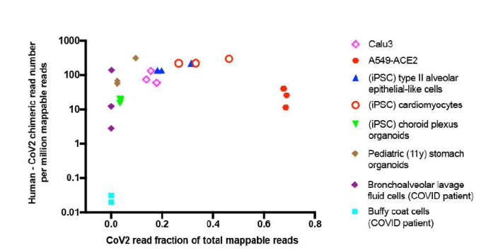 二、RNA测序的结果也不能反映基因组DNA的真实情况 倘若要说这项研究中最重要的涉及体内研究的部分,也就只有基于已发表的新冠患者的RNA测序数据所做的分析了。为了证明新冠病毒的RNA可能逆转录整合到感染细胞的基因组中,研究人员分析了已公开的受新冠病毒感染的细胞的RNA测序数据,发现人-新冠病毒嵌合RNA序列与病毒RNA的水平呈正相关(如下图)。而这却是这项研究中最不能用于支持论文结论的部分。 图注:来自已发表的感染新冠病毒的不同生物样本的RNA测序数据中,人-新冠病毒嵌合读数(Y轴)与新冠病毒总读数(X轴)的比值散点图 首先,我们要区分两个概念:RNA测序(RNA-Seq)和DNA测序(DNA-Seq)。RNA测序主要是在转录组(转录组是指在某一生理条件下,细胞内所有转录产物的集合,包括信使RNA、核糖体RNA、转运RNA及非编码RNA等)范围内分析基因表达的方法,而DNA测序才是直接反映基因组序列的测序方法。RNA是由DNA转录而来,其水平当然可以反映DNA的一些情况,但是仅凭RNA测序的结果来评价基因组DNA是有失偏颇的。 这项研究中发现的人-病毒嵌合序列只能说是嵌合RNA产物,研究已经证实由于RNA测序的整个实验过程中包括了逆转录和PCR扩增的步骤,由相距甚远的基因组之间产生的嵌合RNA产物几乎都属于实验过程中的人工产物[2],因此,这并不能说明病毒的RNA逆转录整合到了细胞基因组中,更不能说明病毒数量越高整合的量越多。除非有DNA测序的结果,否则该研究中这唯一根据体内实验得出的结论可能只是实验误差。 综其两点,这项引发了谣言,并传播恐慌给大众的研究,其实只是提出了一个在实验室里观察到的现象,一不能反应真实体内情况,二不能表现真正基因组DNA结果。就连文章的作者本人也强调他们的研究结果并不意味着新冠病毒在人类细胞中建立了永久的遗传居住地[3]。 对于mRNA疫苗来说,一旦进入细胞内,唯一的行为就是履行它在核糖体中被合成蛋白质、产生免疫原性的职责。整合进人类基因组?仅凭这一个被封装在特殊载体中的、可编码特定蛋白质的mRNA根本做不到。人体内素来缺少处于激活状态的逆转录酶,即使存在,正如上文所述,人类基因组与新冠病毒基因组之间的整合尚不存在合理证据,mRNA疫苗中包裹的mRNA甚至不能被称为一个基因组。所以,就让谣言止于智者吧。 参考文献: 2. C Joel McManus, Michael O Duff, Jodi Eipper-Mains et al. Global analysis of trans-splicing in Drosophila. Proc Natl Acad Sci U S A. 2010 Jul 20;107(29):12975- 3. The coronavirus may sometimes slip its genetic material into human chromosomes—but what does that mean? https://www.sciencemag.org/news/2020/12/coronavirus-may-sometimes-slip-its-genetic-material-human-chromosomes-what-does-mean