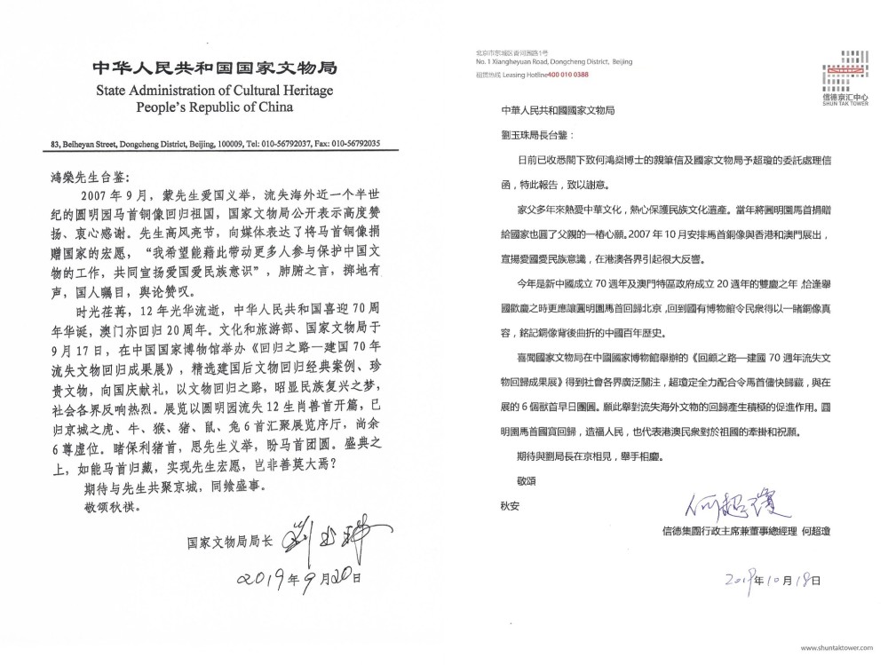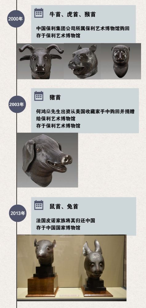 新闻多一点: 7件兽首已“回家” 圆明园兽首铜像中的7件已经“回家”。仍有5尊流落在外。 圆明园兽首铜像原为圆明园海晏堂外的喷泉的一部分,是清乾隆年间的红铜铸像。十二生肖兽首铜像呈“八”字形,分列在喷水池两旁的人身石台上。每个动物就是一个喷泉机关,每到一个时辰,相应的动物口中就会喷水两个小时。1860年英法联军侵略中国,火烧圆明园,兽首铜像开始流失海外。 目前,鼠首、兔首、牛首、猴首、虎首、猪首和马首,共7尊兽首回到国内,仍有5尊兽首流落在外。这5尊兽首中,龙首可能为中国台湾私人收藏家收藏,蛇首、羊首、鸡首和狗首一直下落不明。 每一件兽首回家的路都牵动着国人的心。从牛首、虎首、猴首的国企竞拍,到马首、猪首的华商捐赠,再到鼠首、兔首的外国友人返还,圆明园兽首从星散到重聚,辗转走过的,正是一条中国流失文物回归之路。值得一提的是,猪首铜像也是由何鸿燊于2003年出资购买后送归国家。 圆明园牛首铜像,保利集团竞拍购得,保利艺术博物馆藏; 圆明园虎首铜像,保利集团竞拍购得,保利艺术博物馆藏; 圆明园猴首铜像,保利集团竞拍购得,保利艺术博物馆藏; 圆明园猪首铜像,何鸿燊先生捐赠,保利艺术博物馆藏; 圆明园马首铜像,何鸿燊先生捐赠,圆明园管理处藏; 圆明园鼠首铜像,弗朗索瓦·皮诺先生捐赠,中国国家博物馆藏; 圆明园兔首铜像,弗朗索瓦·皮诺先生捐赠,中国国家博物馆藏; 圆明园龙首铜像,可能为中国台湾私人收藏家收藏; 圆明园蛇首、羊首、鸡首、狗首下落不明。