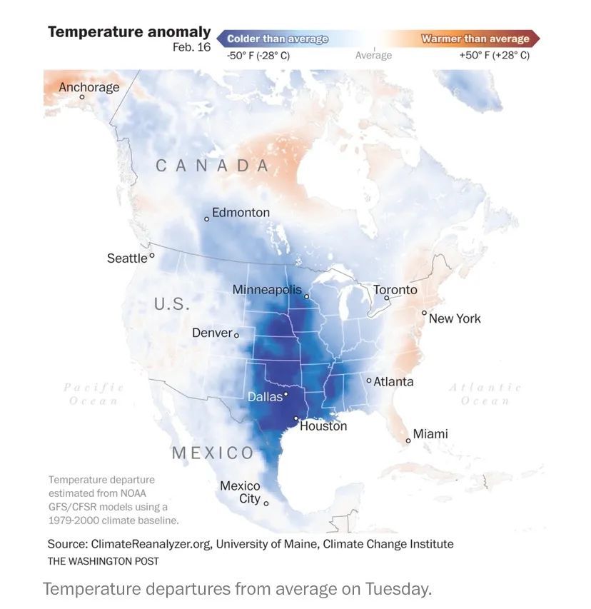 据报道,得克萨斯州有超过250万人失去了电力供应,其中仅达拉斯和沃斯堡都会区就有50多万人受到断电困扰。整个得州的气温目前处于0℃以下,南部布朗斯维尔(Brownsville)的温度为-3.9℃,而潘汉德尔(Panhandle)的温度则低至-26℃。 圣安杰洛(San Angelo)当地时间15日早上气温降到-18.3℃,这是该地区历史上中第二冷的纪录。得州其他地方,包括卢伯克(Lubbock)、达拉斯(Dallas)、奥斯汀(Austin)、圣安东尼奥(San Antonio)和科珀斯克里斯蒂(Corpus Christi)都创下了单日最低气温纪录。 由于冰雪天气,休斯顿哈比机场(Both Houston Hobby Airport)和布什洲际机场(Bush InterContinental Airport)目前都处于关闭状态。此外,达拉斯-沃斯堡国际机场已暂停了15日下午前的所有抵达航班。 得州东部大部分地区,包括达拉斯、圣安东尼奥、奥斯汀、休斯顿、科珀斯克里斯蒂和布朗斯维尔,仍处于冬季风暴的影响之下。据报道,上述地区的出行条件非常危险或已达到几乎不可能出行的状态。(央视记者 徐德智)