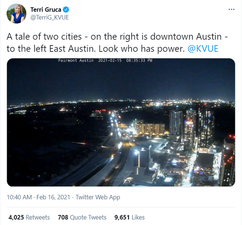 在舒格兰,一位祖母带着三个孙子女用壁炉取暖,最终引发大火,四人全部遇难;在休斯顿,一位母亲带着女儿,在车库里开汽车空调取暖,最终因为一氧化碳中毒死亡;还有一位78岁的得州老人,在自己家前院摔倒了,严寒中冻了两个小时之后去世。。。。。。 得州电力“瘫痪”引发的悲剧,让美国媒体炸了锅。《纽约时报》在官网搭建专题,实时更新得州暴雪、冻雨情况的最新进展。《华尔街日报》的加粗标题“得克萨斯州的严寒中,绝望的家庭冒险取暖”提醒当地政府,看不到救济希望的民众只能用燃气灶生活取暖。 作为美国第二大州,得州拥有全美41%的石化产量和28%的风能供应,有“能源心脏”之称。如今,这一名号已成为赤裸裸的讽刺。得克萨斯大学能源研究所所长直言,“这是一个把能源和电力作为骄傲的州的最大失败!”