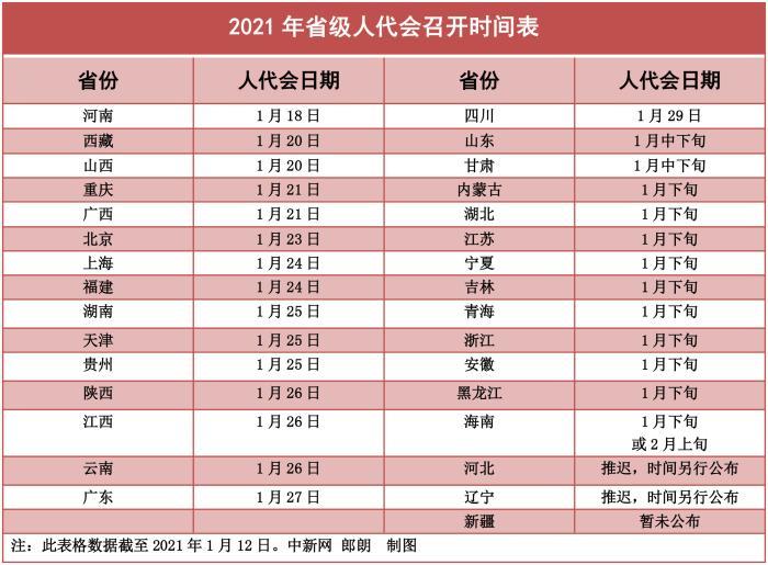 河北、辽宁推迟人代会召开时间 截至目前,近30个省份明确了2020年省级人代会的召开时间。由于2021年的农历春节在2月12日,目前已公布人代会召开时间的省份均将会议日期定在2021年春节前举行。 在已公开会议时间的省份中,河南的人代会是召开时间最早的,定于1月18日开幕。 1月下旬是省级地方两会召开的密集期,从公布的信息来看,大多数省份的开会时间定在1月下旬。 截至目前,已经至少有16个省份明确了会议开幕的具体日期,例如,山西、西藏的省级人代会将于1月20日同日召开,陕西、江西则在1月26日同日召开。而诸如内蒙古、湖北、江苏、甘肃等,目前这些地区公布的人代会召开日期多为“下旬”或“中下旬”举行。 值得一提的是,近日,河北、辽宁已经决定将省级人代会的日期推迟。 1月11日,河北省十三届人大常委会召开主任会议,决定推迟召开河北省第十三届人民代表大会第四次会议,具体开会时间另行决定。 据河北日报报道,会议指出,当前该省正处于遏制疫情蔓延、打赢疫情防控歼灭战的关键时期,为全力保障当前疫情防控工作需要,切实保障人民群众生命健康安全,有必要适当推迟召开省第十三届人民代表大会第四次会议。 12日,辽宁省十三届人大常委会主任会议也决定,适当推迟召开辽宁省第十三届人民代表大会第五次会议,具体开会时间由省人大常委会主任会议另行决定。