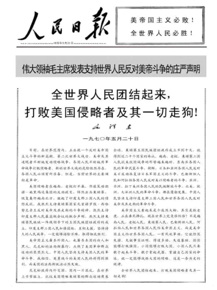 52年前“美帝是纸老虎”的观点震耳欲聋 在52年前的今天,毛主席发表了《全世界人民团结起来,打败美国侵略者及其一切走狗》的声明,这一声明在当时是震天动地,给当时遭受美帝欺压的各国人民送上了一个深情告白。 在这篇文章中,毛主席根据第三世界的大多数国家正“反美争取独立”的国家抗争的事实,做出了这篇文章,并断言世界反帝人民终将取得胜利。同时在这篇文章中,毛主席还从现实角度以及辩证法的角度表明,要将美国人民与美帝分开。 值得注意的是,52年前的今天,中国正面临着国际上前所未有的压力,1970年,美国支持柬埔寨的朗诺发动军事政变,建立军人独裁政权;而当时美国还在进行越南战争,如果仔细看中国周边地图的话,可见中国当时是强敌环伺。 在此背景下,中国人民并未害怕,毛主席所发表的这篇文章对当时中国人民的斗争精神起到了很大的鼓舞。果然一年后,美国在越南战场上再也撑不下去,时任总统尼克松的亲信、总统国家事务助理基辛格秘密借道巴基斯坦访问中国,开启了中美的破冰之旅。不得不说,毛主席的这篇文章真是一针见血地指出了问题,美国正在世界各地遭遇抗争,并严重受挫。自1973年美国撤出越南后,直至1991年海湾战争,美国就一直没敢再对外发动大规模战争,生怕再陷入类似于“越南战争”的泥潭。