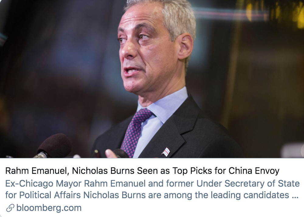 2005年至2008年,伯恩斯曾在美国前总统小布什任职期间,担任政治事务副国务卿;2001年至2005年,伯恩斯是北大西洋公约组织的美国常驻代表;1997年至2001年,伯恩斯担任美国驻希腊大使。 与此同时,伯恩斯还曾是美国前总统克林顿的特别助理,主要负责俄罗斯、乌克兰和欧亚事务。 知情人士透露,目前,拜登政府正在寻找美国驻华大使候选人,而伯恩斯符合拜登政府的标准,具有丰富的外交经验。 据彭博社报道,前芝加哥市市长拉姆·伊曼纽尔也被列入了美国驻华大使的名单中。自拜登在2020年总统大选获得胜利以来,就曾多次传出伊曼纽尔将在拜登政府担任职务的消息。 伊曼纽尔现年61岁,一直是民主党的知名政治人物,还在民主党竞选筹款中发挥了重要作用。 拉姆·伊曼纽尔和尼古拉斯·伯恩斯被视为潜在的美国驻华大使。/ 彭博社报道截图