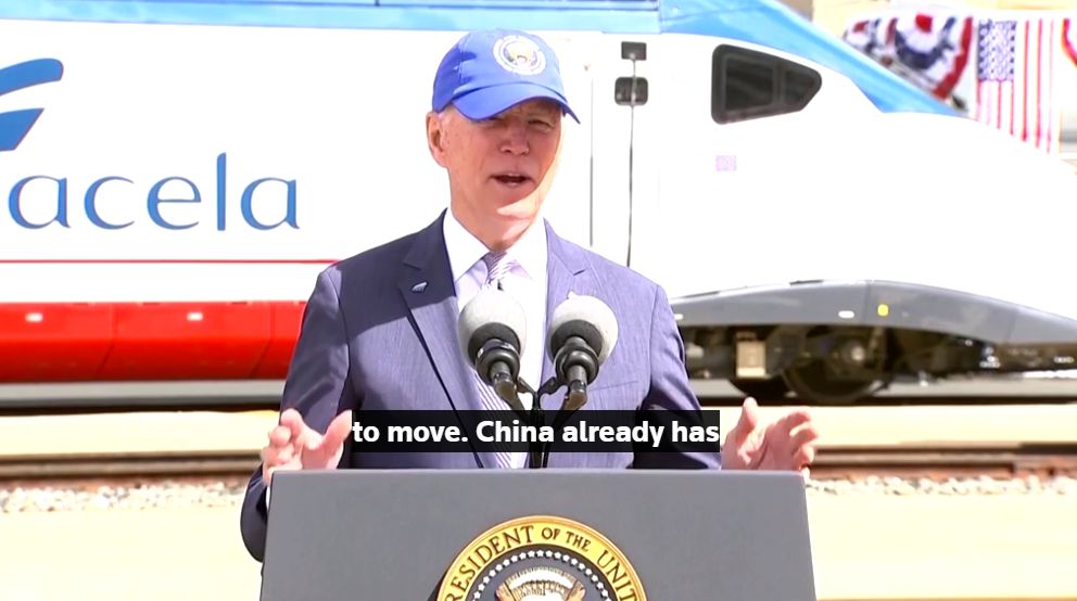 在说完了美国铁路能够给国内带来的种种有利因素后,拜登又拿出了那套“美国不能在竞争中落后”的理论,竞争对手自然还是中国。 他说道:“我们要记住,我们在同世界上的其他国家竞争。人们到这里来做生意,在这里安家落户,繁衍生息,是因为他们能够享受交通乃至所有的基础设施。这构成了我们能够同其他国家竞争并赢下21世纪的资本,所以我们必须行动起来。” 拜登称,美国的基础设施现在远远落后于世界其他地方。“中国已经拥有2.3万英里的高铁,时速达220英里/小时,占全球高铁总里程的三分之二,而且还在达成400英里/小时的时速。” 说完中国的优势,拜登没有忘记给美国打气:“我们落后了,但是,美国又行动起来了。我们是美利坚合众国,只要我们齐心协力,没有什么不是我们能力所及的,没有什么是我们做不到的。”