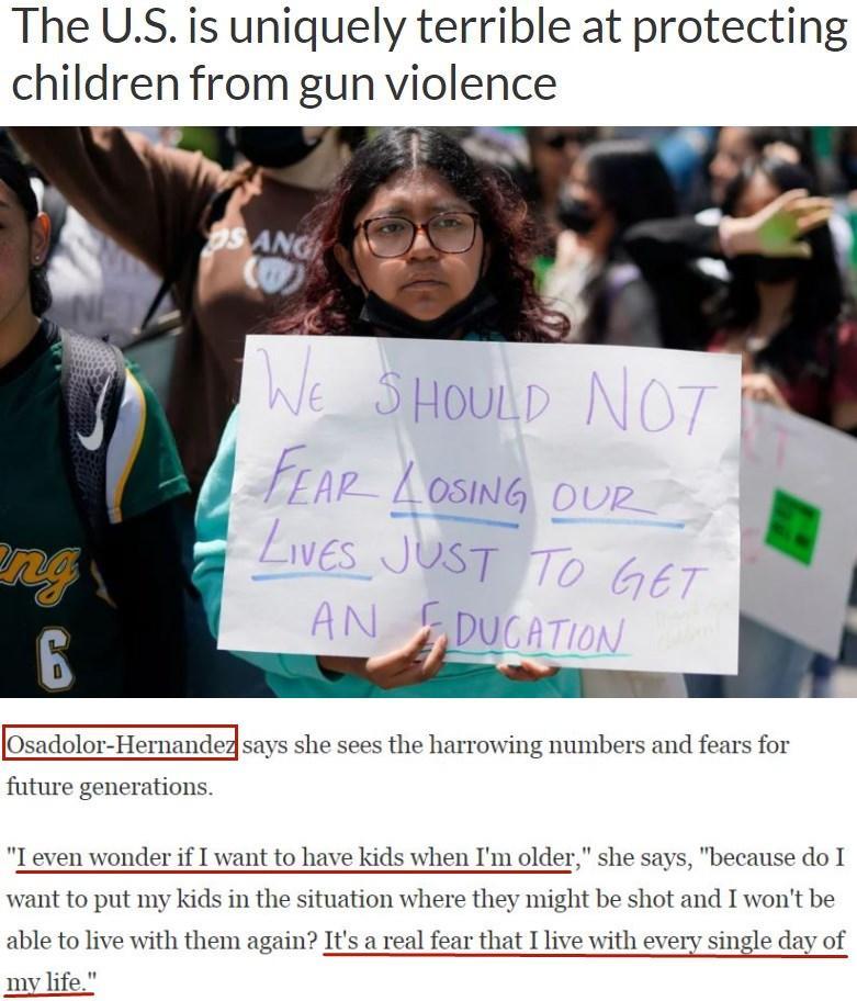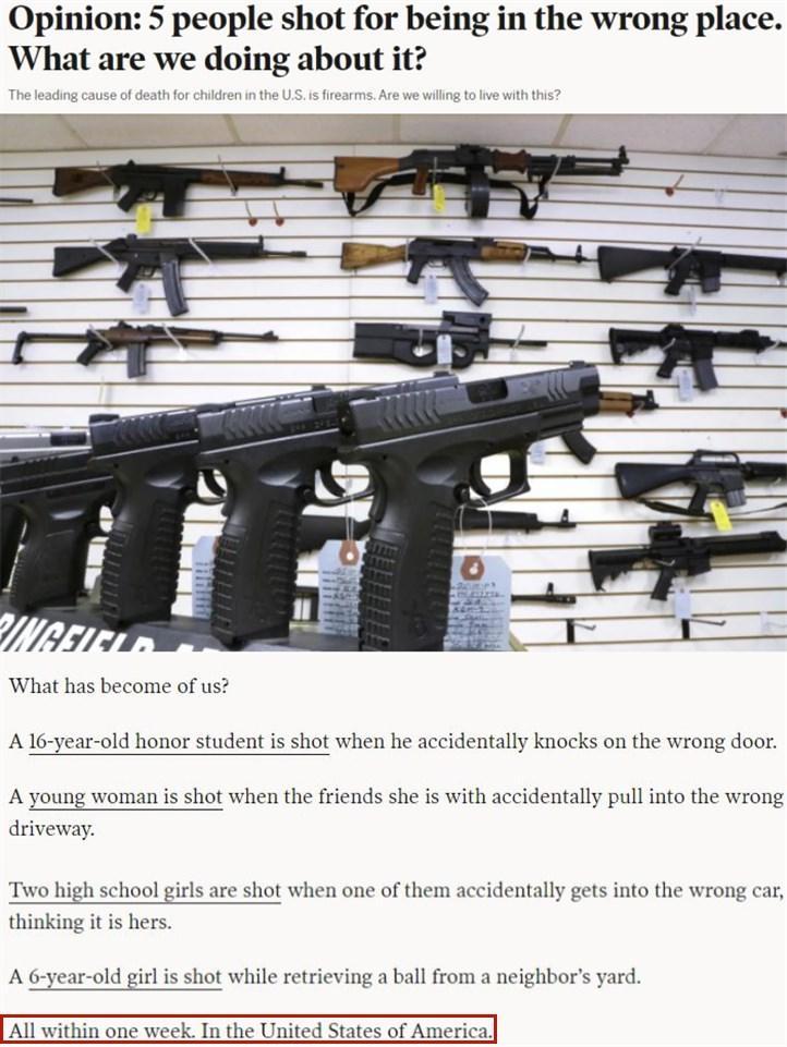 文章讽刺说,某个词要想成为行话术语,必须广为人知而且是人们经常遇到的事务。如此泛滥的枪支暴力已经成为美国人生活中“很正常”的一部分,以至于人们会有各种各样不同的词汇、术语来描述它,就像古希腊有许多词来形容爱、爱斯基摩人形容雪的词很多一样。 文章指出,美国人用于枪击事件的词也不少,比如警察枪击、大规模枪击、飞车枪击、校园枪击等等。但在当下的美国,人们正在寻找一个词用来说明“因按错门铃而惨遭枪击身亡”,感觉即便是美国如此丰富的枪支暴力相关词汇也都赶不上2023年的情况。 作家丽塔·梅·布朗(Rita Mae Brown)曾说:“语言是文化的地图。它为你解答人们从哪里来,到哪里去。”文章不禁问道:“我们恐怖病态的枪支暴力类型又说明我们会走向何方?亦或是,这些几乎不停发生的枪击事件,就是我们要到达的终点?” 文章批评称,美国的民选官员满口都是“无意义的暴力”,仿佛这种暴力是例外。但事实上,“理智的暴力”才罕见。那些拥枪者鼓吹所谓“持枪好人”,但普通人阻止大规模枪击事件的概率还不到3%。 许多美国人在谈论“控枪”的时候,不是支持就是反对,但在一个枪支数量比人口还多的国家,这又算什么呢?美国的领导人总是说他们的“思念和祈祷”(与受害者同在),这些词曾经代表了同情,现在仅仅显示说话的人根本没思考,只是条件反射地以此来为不作为打掩护。 而“现在还不是时候”这样的话锋一转,假装是在尊重受害者,最终只会让更多人成为受害者。在前面提到的那起枪击事件发生的第二天,得州州长格雷格·阿博特(Greg Abbott.)并没有呼吁实施更严格的枪支法律,甚至还说受害的一家人是“非法移民”,试图转移话题。