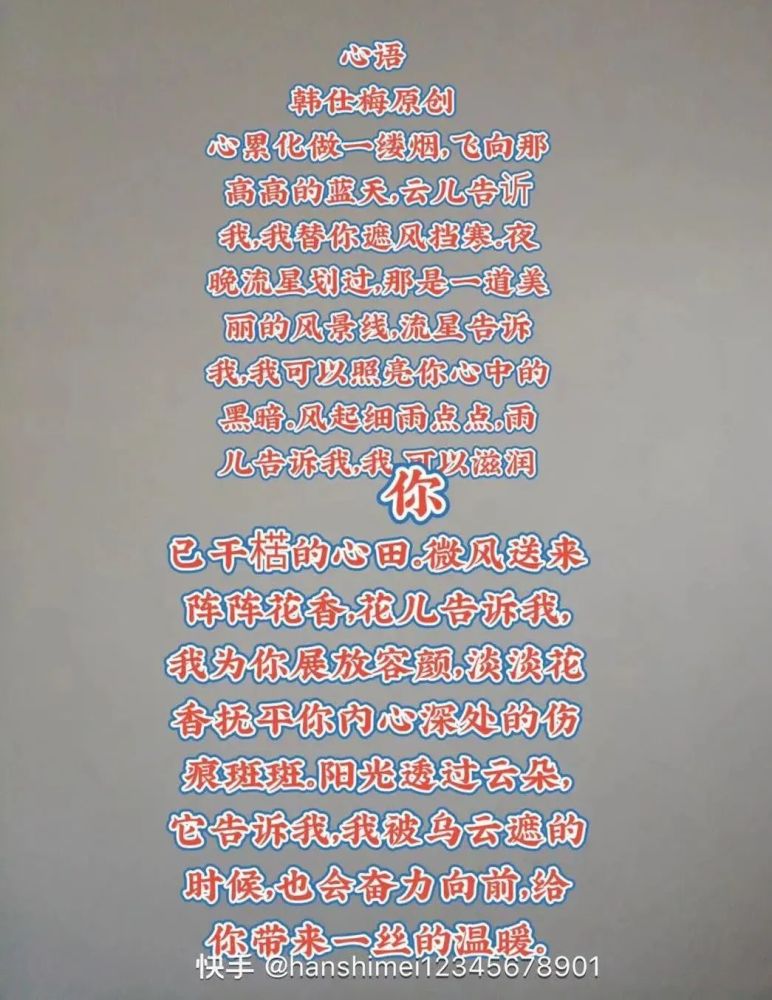 在《为你读诗》的平台上,有演员、主持人、作家、诗人,每晚十点给听众读诗。当平台找到韩仕梅,希望她能读一首自己创作的,向上而激扬的诗的时候,她激动又迟疑。她觉得自己写的算不上诗,更重要的是她的诗全是“苦”与“痛”,没半点欢快。 但结果出乎韩仕梅的意料。有人说,韩仕梅话音一传出来,自己眼泪就掉下来了,“声音带着无法描述的坚韧感”。这评价让韩仕梅惶然,“我不会说普通话,那也不算诗吧,格律什么我都不懂。” 不懂格律的韩仕梅,去年四月开始写诗,在快手上,她陆续发表了一百四十多首诗,并拥有了三千多粉丝。在上传到快手之前,她在女儿不用的本子上写。给每一首诗配上一张山水图画做背景,还有一曲悲伤的音乐。 她只读了半年初中,对视频制作也不甚熟练,字幕里常夹杂着错字和拼音,但这不影响她创作的热情,灵感有时突如其来,两三分钟,一首诗就写完了。创作地点也不受限,工厂的厨房、几平米的宿舍都是写诗的好地方。韩仕梅喜欢那个宿舍,“可美”,在这几平米的空间里,她就拥有了绝对的自由。 《心语》那首诗就来自于那里,当时她刚在厨房里做完午饭。 麦苗、田埂、细雨,门口的野腊菜花都是她的灵感来源。再往前追溯,这一切创作起源于一首歌:“谁是我,我是谁,时间变成了盗贼,惊扰少年英雄梦,掠走天真和无畏”,歌是手机里随机播放的,韩仕梅听了,心咚咚跳,仿佛歌唱的就是她自己。