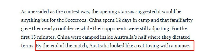 第70分钟尹鸿博犯规吃到黄牌。第74分钟塞恩斯伯里禁区外推倒尹鸿博,艾克森任意球打近角偏出。第78分钟澳大利亚队用3号埃尔德和7号杰戈换下比伊奇和欧文。第81分钟中国队用张玉宁换下艾克森。第85分钟麦格里换下罗吉奇,两队的换人名额全满。 澳大利亚下半场完全控制局面,中国队除了艾克森的任意球射门,就没有其他射门,还好澳大利亚队也没有再扩大比分。第90分钟马比尔禁区外射门被颜骏凌后仰扑出。最终中国队0比3负澳大利亚队。 中国队:1-颜骏凌;5-张琳芃、6-蒋光太、22-于大宝(20-王刚 45分钟)、3-王燊超;13-金敬道(19-尹鸿博 62分钟)、15-吴曦、10-张稀哲(8-蒿俊闵 45分钟);7-武磊、9-艾克森(18-张玉宁 81分钟)、17-吴兴涵(14-韦世豪 50分钟) 澳大利亚:1-马修-瑞恩、16-比伊奇(3-埃尔德 78分钟)、20-塞恩斯伯里、19-苏塔、4-瑞安-格兰特、22-杰克逊-欧文(7-杰戈 78分钟)、23-罗吉奇(14-麦格里 85分钟)、10-赫鲁斯蒂奇、6-马丁-博伊尔(13-穆伊 68分钟)、9-塔加特(15-杜克 68分钟)、11-马比尔 (孟巍)