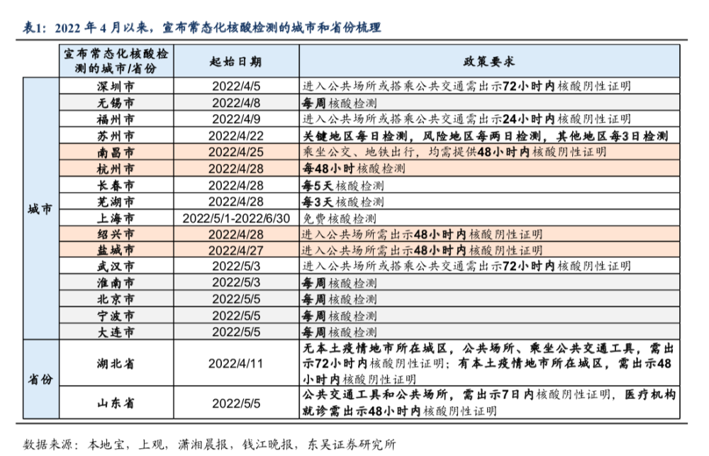 “常态化核酸检测” 综合多地公布的细节来看,常态化核酸检测往往是通过打造便民核酸检测服务圈实现。 例如,深圳按“每3万人1个便民核酸点”的标准,打造“1530”核酸服务圈(步行不超过15分钟,排队不超过30分钟 ),同时推出“核酸点一键查”掌上服务。据深圳卫健委官方消息,深圳93.6%的社会面病例均是在便民核酸检测点“早发现”。 上海同样在加速构建“15分钟核酸服务圈”,包括在居民社区、办公场所、企业园区、地铁站周边、交通场站等区域布局了一批便民采样点,分别有固定采样点、便民采样点和流动采样点。 据官方消息,截至5月4日,上海全市共布局设置各类核酸采样点近9000个,其中4500多个点位已经布设完成开放。 与此同时,各地对常态化核酸检测的频率也作出了相应的规定,最常见的检测频次为1周1检、3天1检或2天1检。 据浙商证券,核酸检测常态化后,相关受益领域主要有三类,包括:基础设施建设(核酸采样点及解决方案),第三方检测实验室(ICL)及加建产能带来的仪器设备需求,核酸检测试剂及耗材等。 不过,《科创板日报》记者注意到,由于核酸检测试剂面临着一定的降价压力,因此在此轮行情中,“便民核酸采样点”概念可能相对更受资金的追捧。