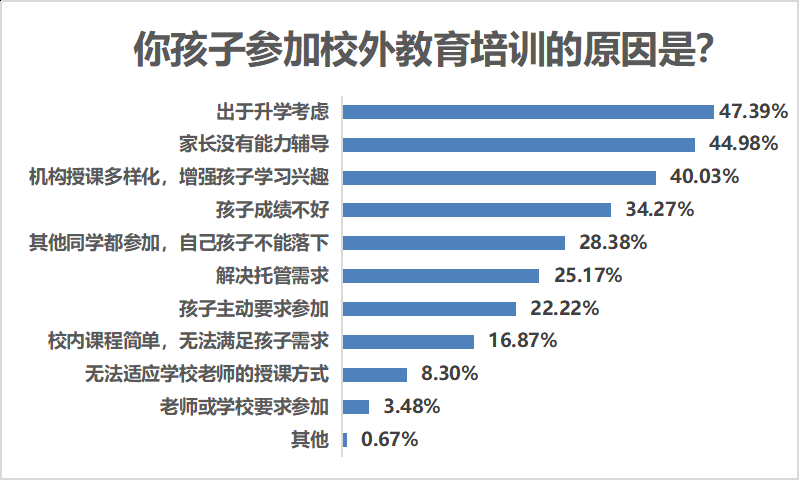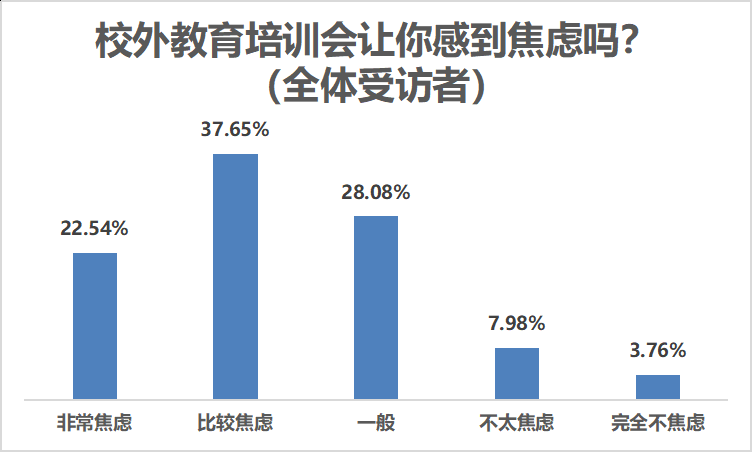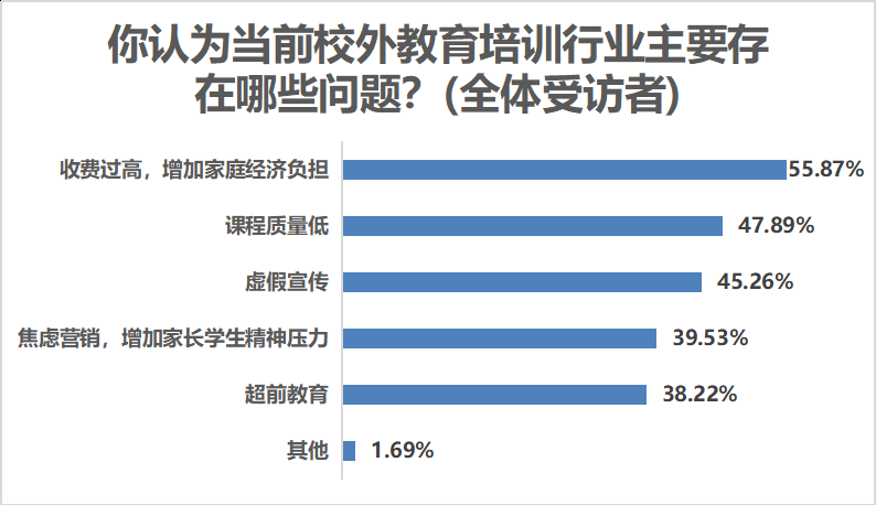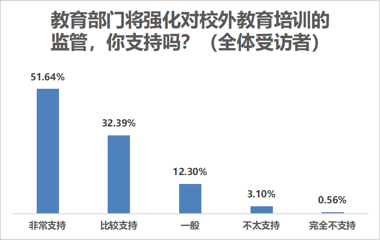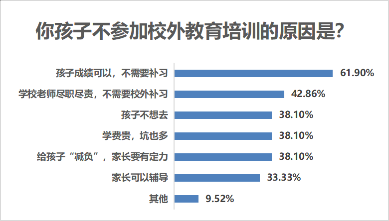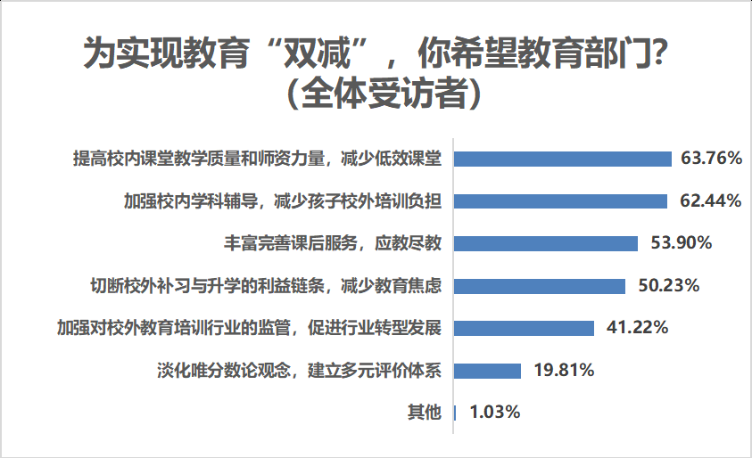 为实现教育“双减”,各有六成人希望减少低效课堂、加强校内辅导 为实现教育“双减”,受访者有哪些建议?63.76%的受访者希望教育部门“提高校内课堂教学质量和师资队伍,减少低效课堂”,62.44%的受访者希望“加强校内学科辅导,减少孩子校外培训负担”,53.90%的受访者希望学校要“丰富完善课后服务,应教尽教”,超五成受访者希望切断校外补习与升学的利益链条,减少教育焦虑,还有超四成受访者希望教育部门加强对校外教育培训行业的监管,促进行业转型发展。 相较而言,超六成家长受访者更希望教育部门加强校内学科辅导,减少孩子校外培训负担;超七成非家长受访者则认为当前低效课堂较多,更希望提高校内课堂质量和师资力量。 时隔五年,南都民调再次调查学生校外培训情况,发现当前学生上培训班的现象更为普遍化、低龄化,同时校外补课时间也更长,导致现在不少学生除了要完成校内课业,还要兼顾校外补习,并未做到真正“减负”。问及原因,不少家长在调查中反映,一是升学的刚需是客观且长期存在的,二是孩子有辅导需要,但家长能力有限,既然学校无法完全解决其需求,家长只能选择校外培训机构达到目标,尽管需要支付高昂的费用,也加重了自己的焦虑感。总而言之,校外培训班加重了中小学生的课业负担,更成为不少家庭日渐沉重的经济负担。 对于校外教培行业的监管,家长们在本次调查中给予了高度的支持,希望从机构供给端入手实现校外“减负”,切实将学生从校外学科类补习中解放出来。与此同时,受访者寄望于学校进一步提高课堂教学质量和师资力量,加强校内学科辅导,应由学校和老师承担孩子辅导任务,尽可能让学生在学校就完成知识的理解和消化,减少家长的辅导负担和补习负担,减缓广大家长的教育焦虑,真正落实“双减”。 调查概述: 本次调查时间为2021年7月7日至7月12日,通过网络分发和线下采集共回收1065份有效问卷,其中家长受访者填答问卷有768份,占72%;非家长受访者填答问卷有297份,占28%。 社会调查与公共舆情研究课题 消费生活监测榜第93期 项目出品:南都民调中心 项目监制:谢斌 张纯 项目主持:谢小清 项目执行:南都研究员 谢小清 涂长芳 麦洁莹 沈红媛李伟锋 实习生 吴泓昊 李明晖 黄梓怡 连安琪