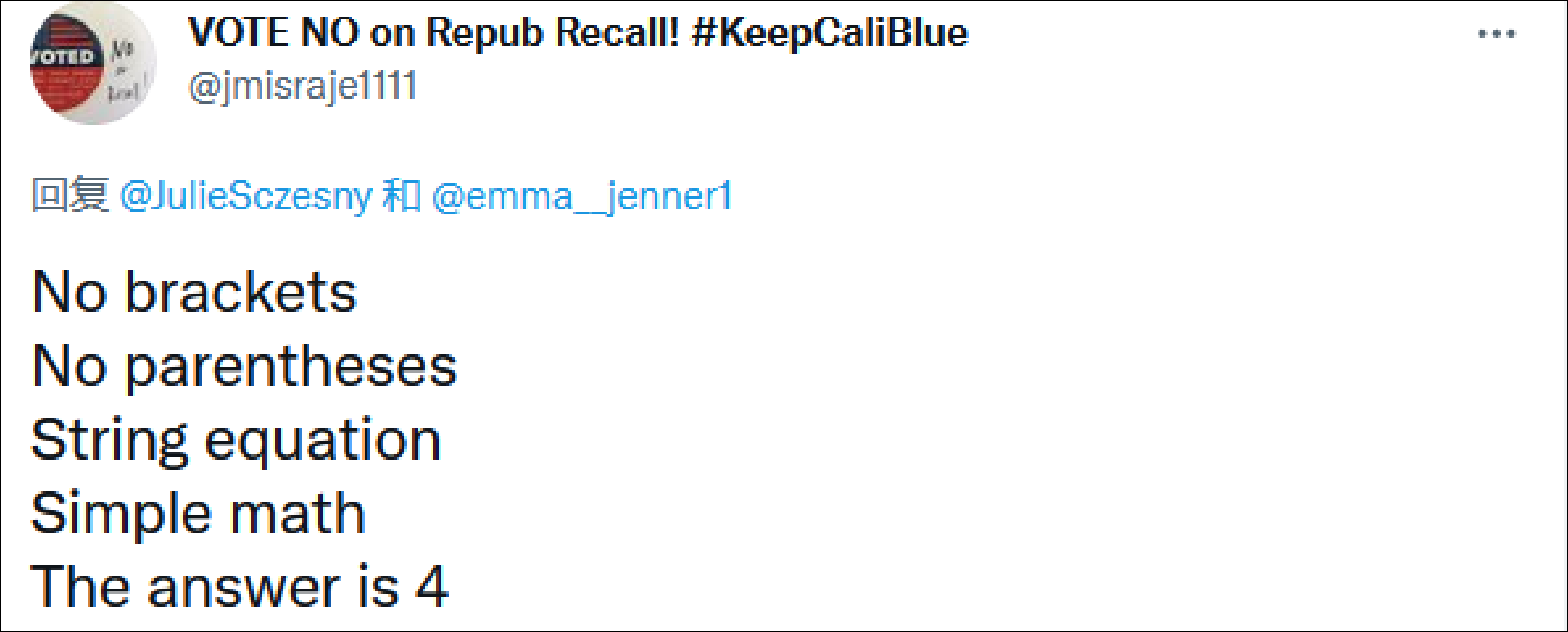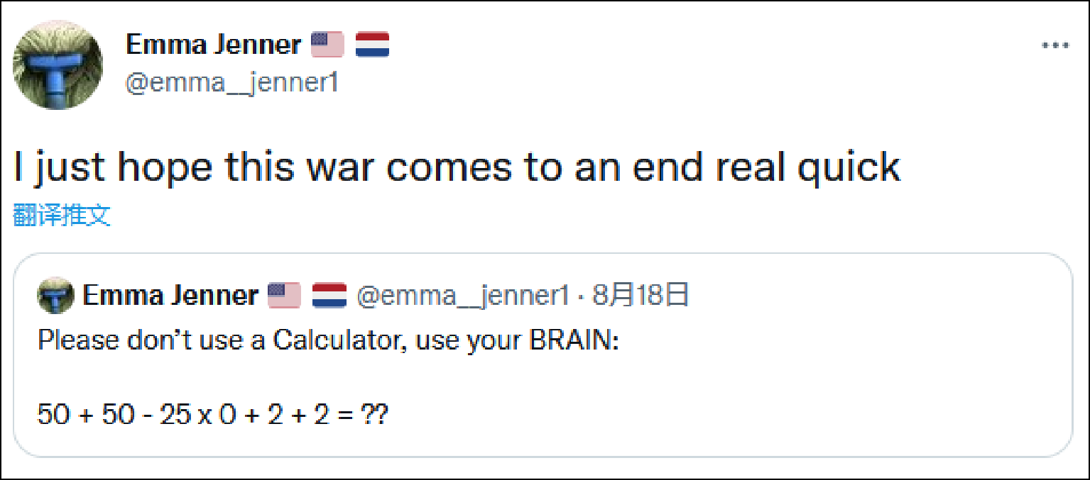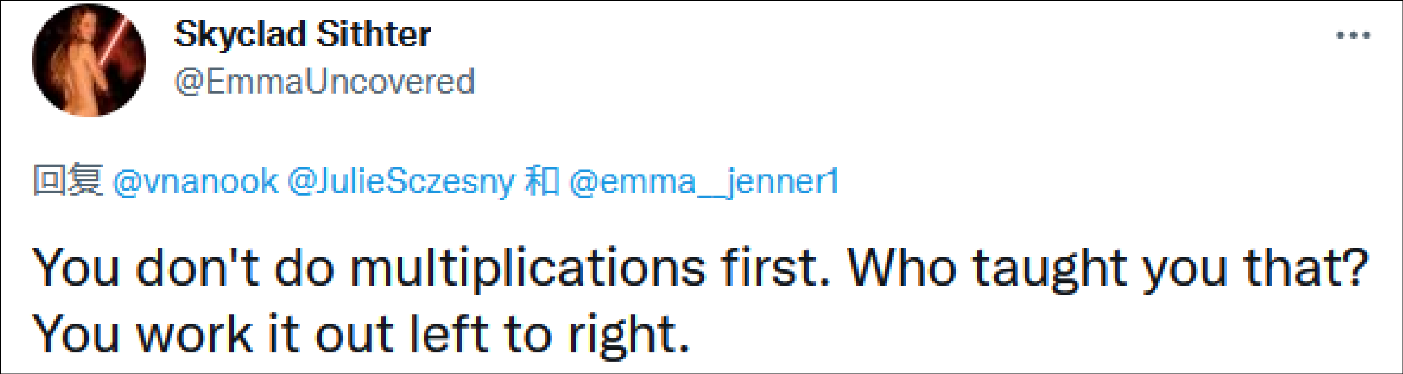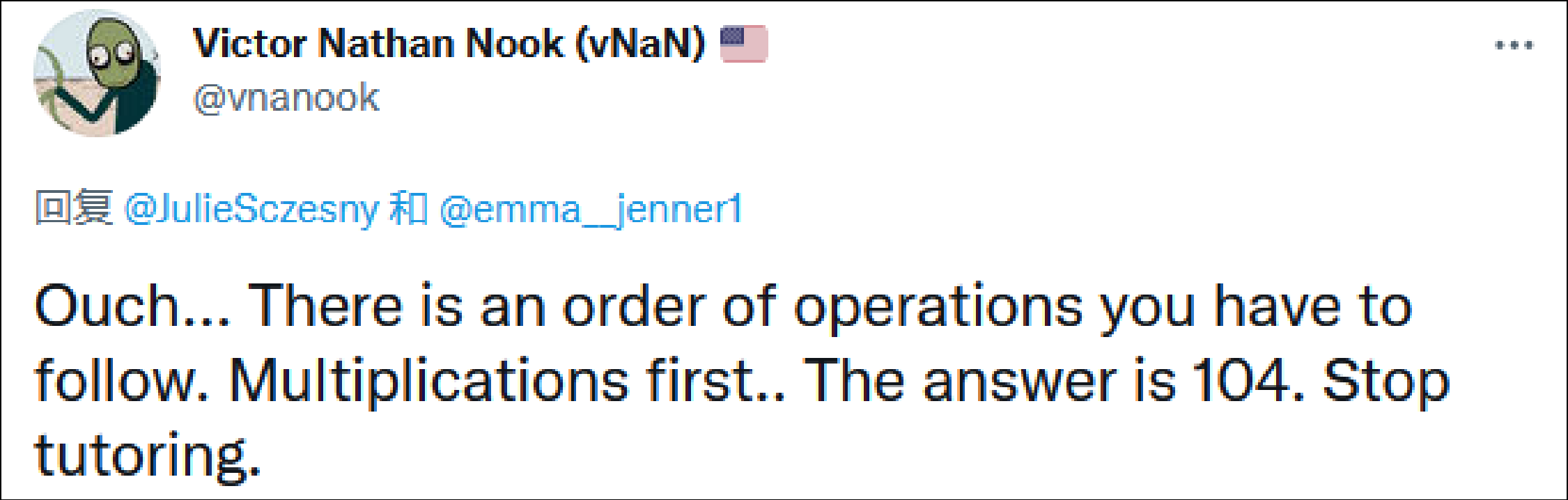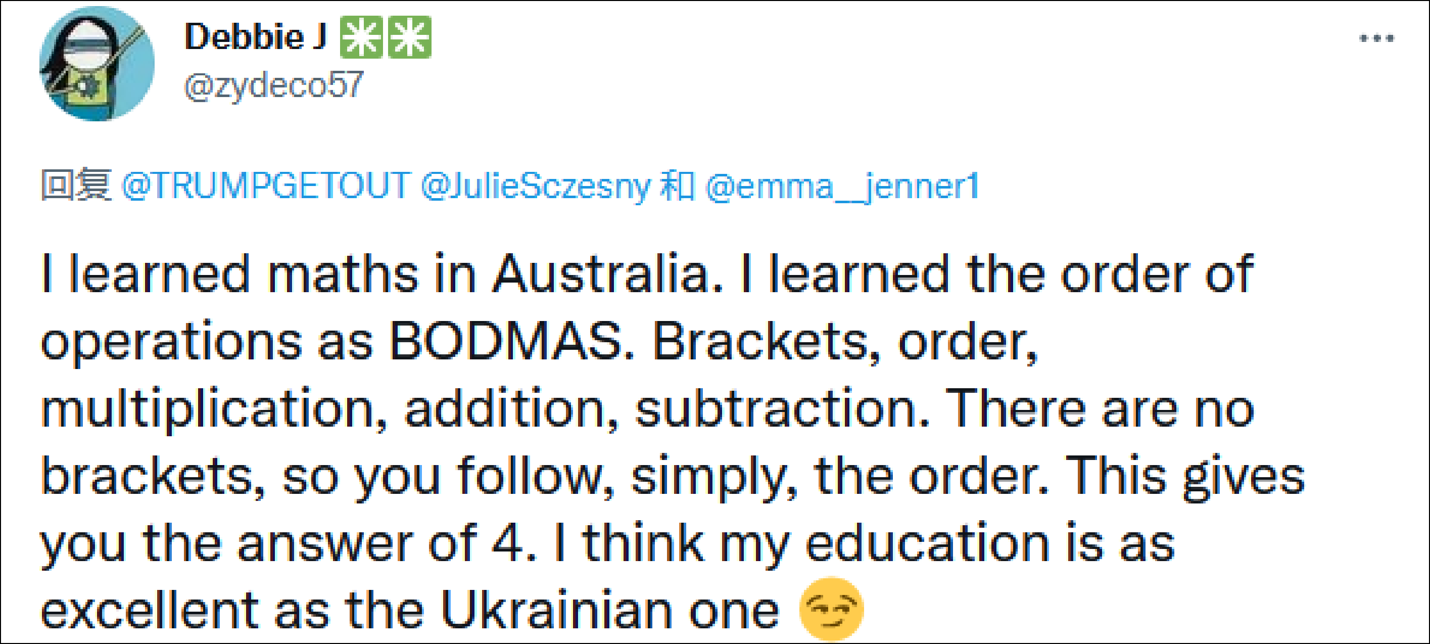 不过,并不是所有人都把这个知识学明白了…… “我在澳大利亚学的数学,也学会了运算的操作顺序,也就是BODMAS——括号,指数,乘法,加法,减法。这里没有括号,所以你可以简单地按照顺序进行操作,答案是4。我认为我的受教育水平和乌克兰人一样好。”