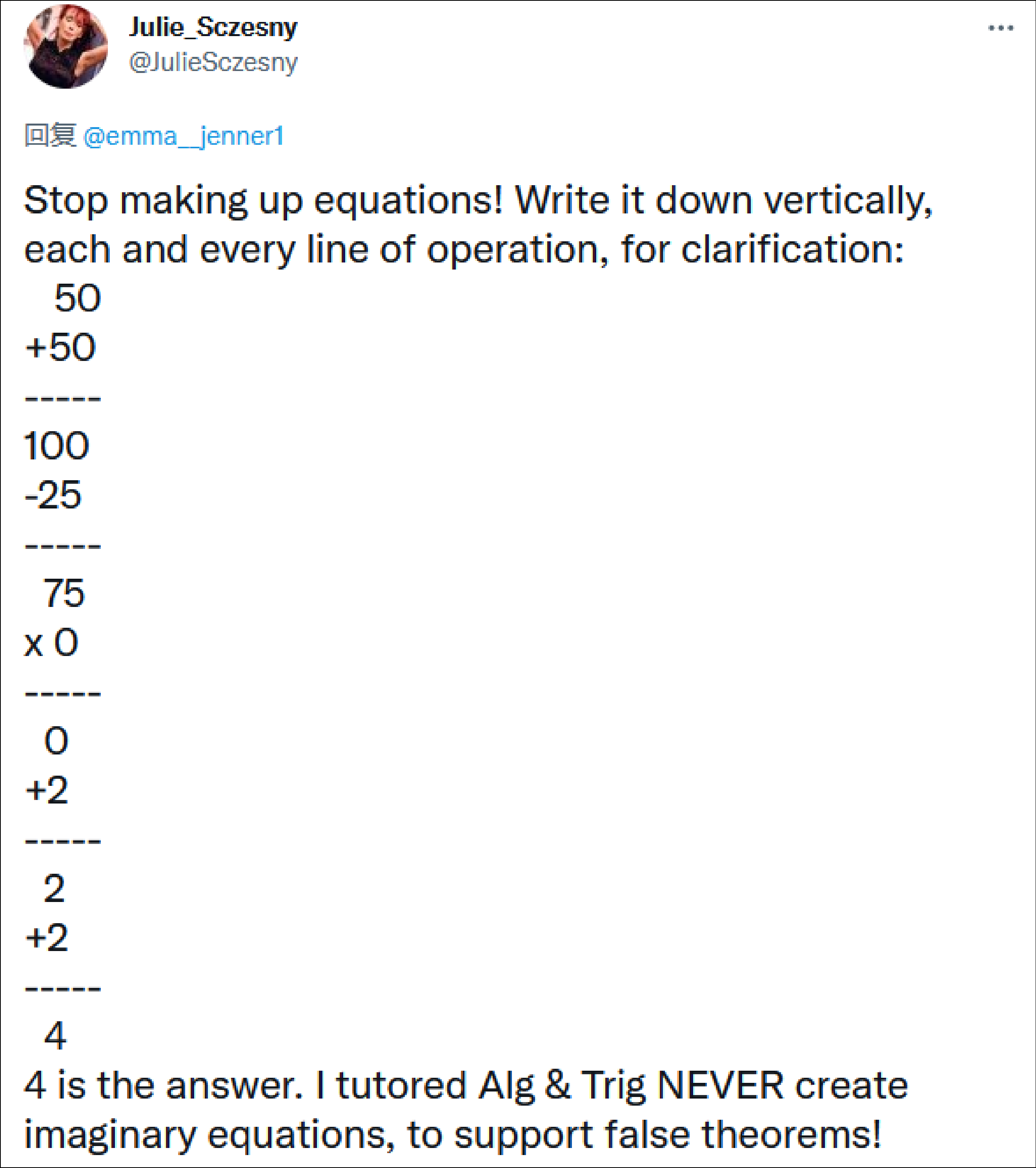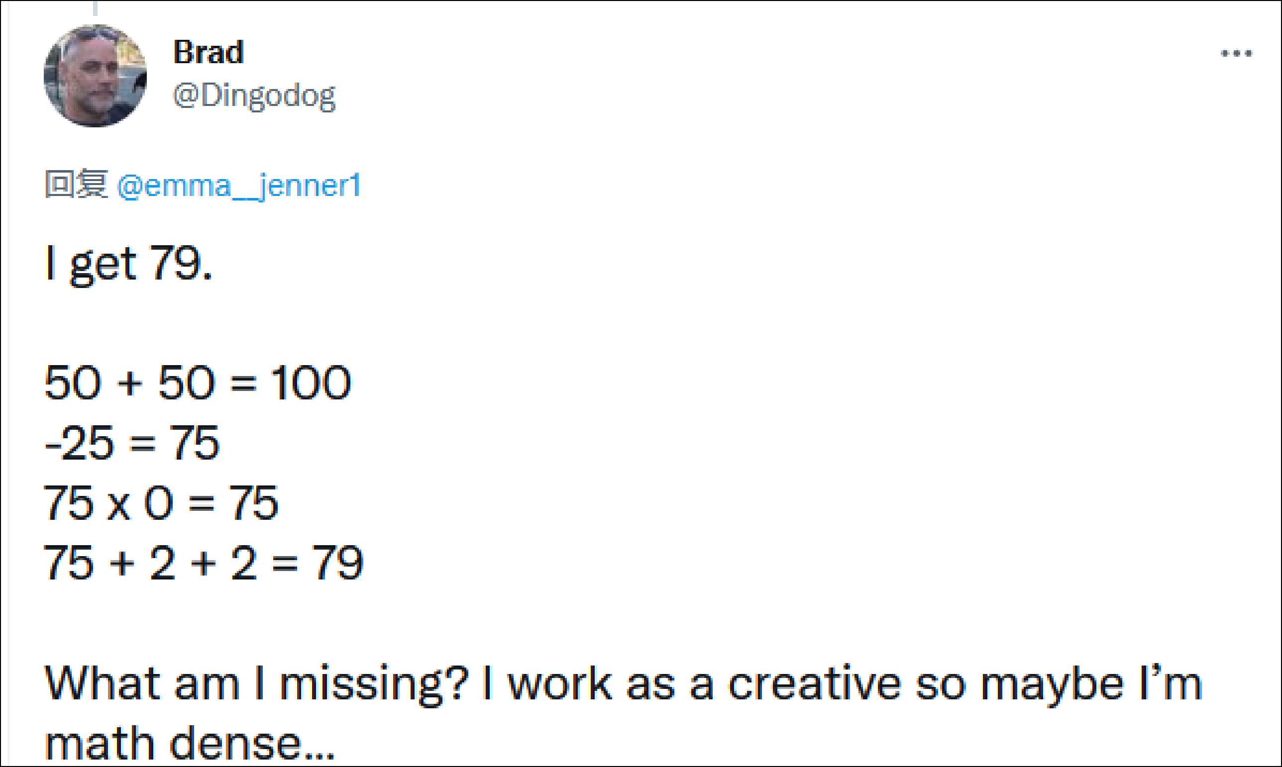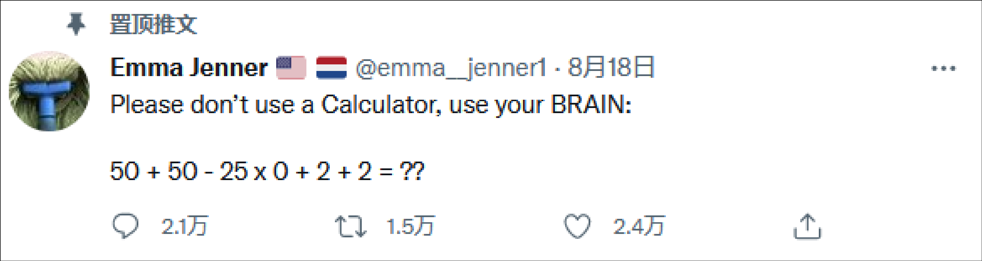 事情的起因是这样的。 8月18日上午,一位外国网友在推特上发了这么一条内容:请不要用计算器,算一算“50+50-25×0+2+2=?”的答案。 截至本文发稿时,这条推文已经有了2万多条跟评,1.5万次转发。