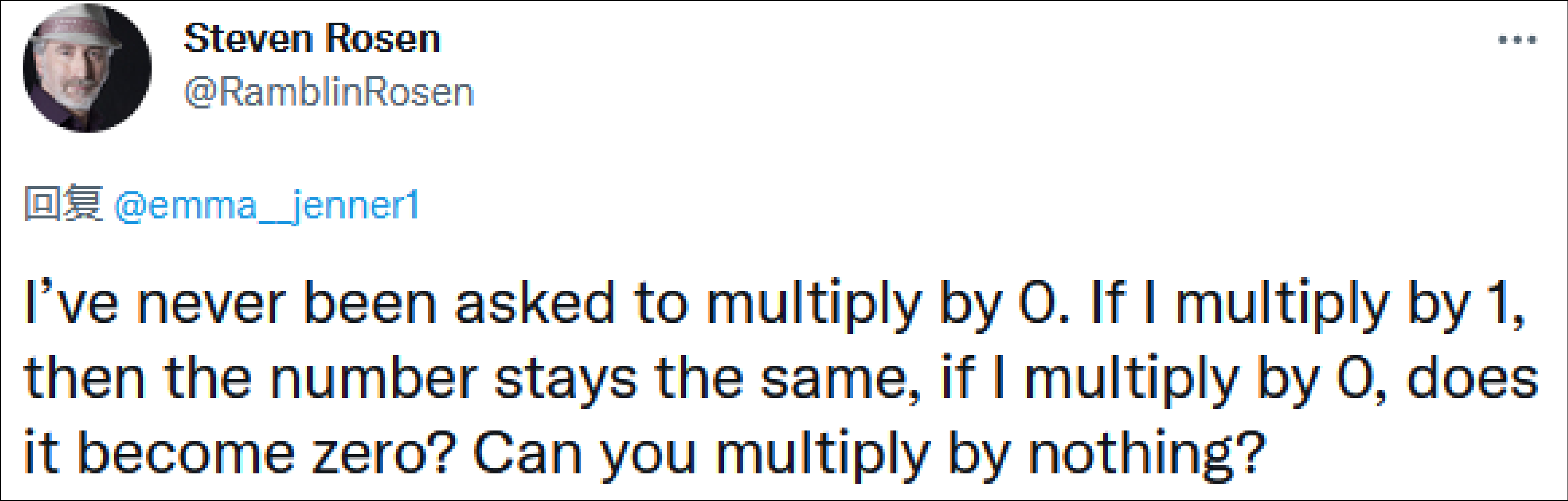 “从来没有人要求我乘以0。如果我乘以1,数字保持不变,可如果我乘以0,它就变成0了吗?你能做到乘以‘无’吗?”