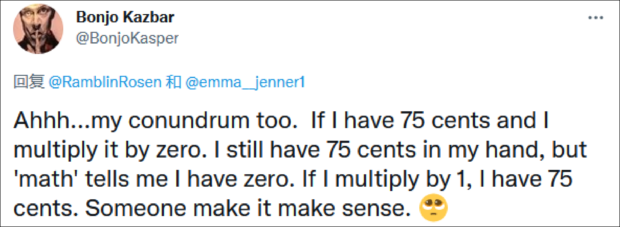 “啊…这也是我的难题。如果我有75美分,我把它乘以0。我手上还有75美分,但“数学”告诉我,我已经是0美分了。乘以1,得到75美分。有人能说得通吗。”