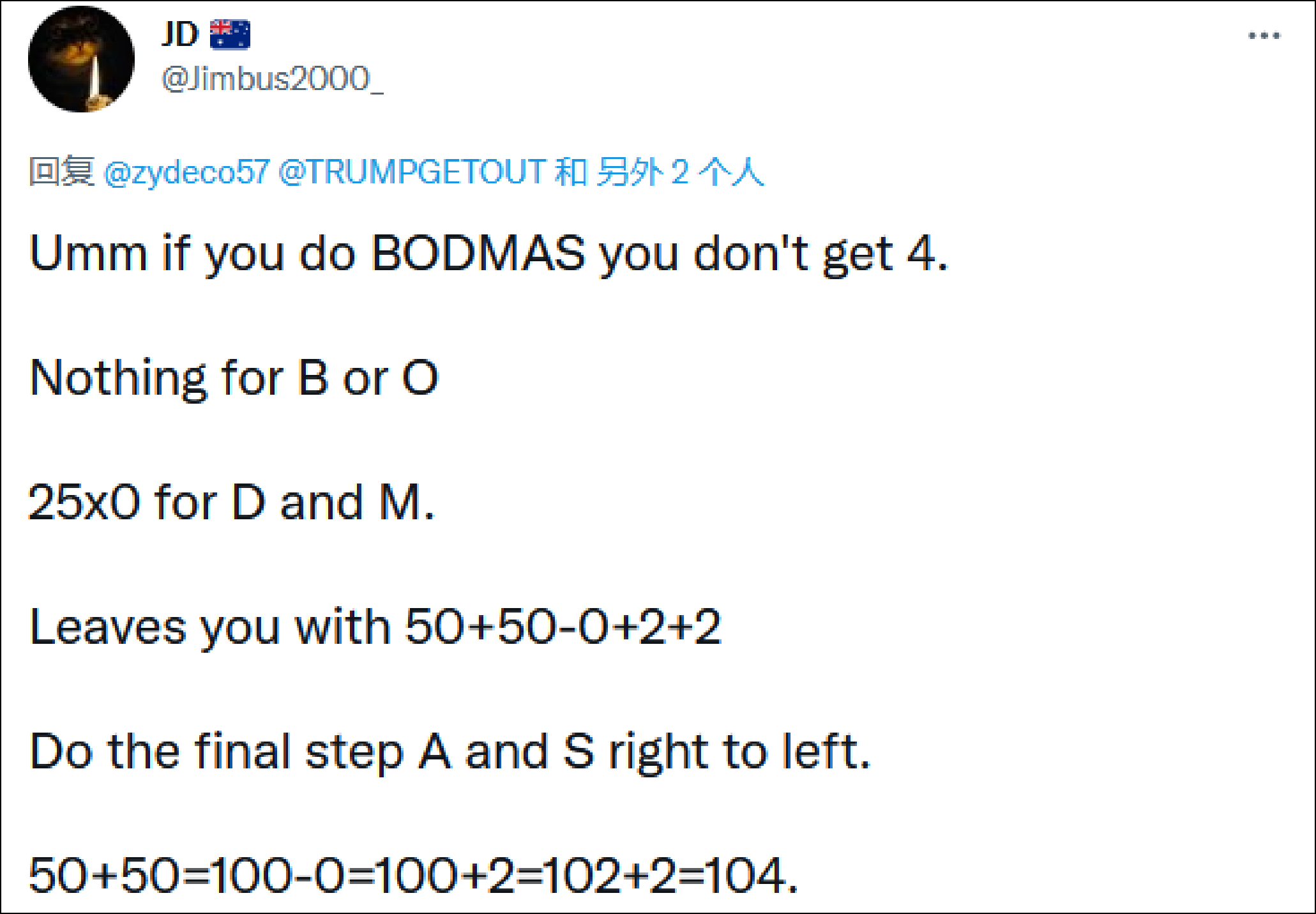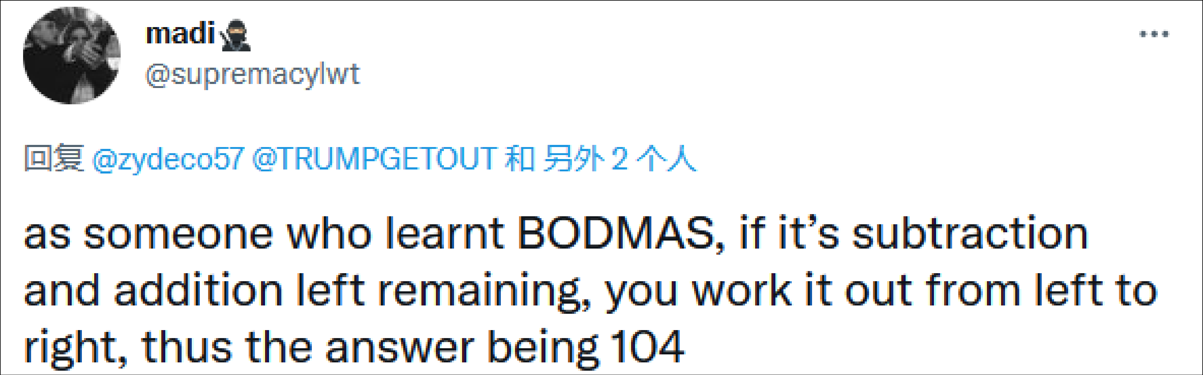 “作为一个学过BODMAS的人,只有在剩下减法和加法的时候,才从左到右算,所以答案是104。”