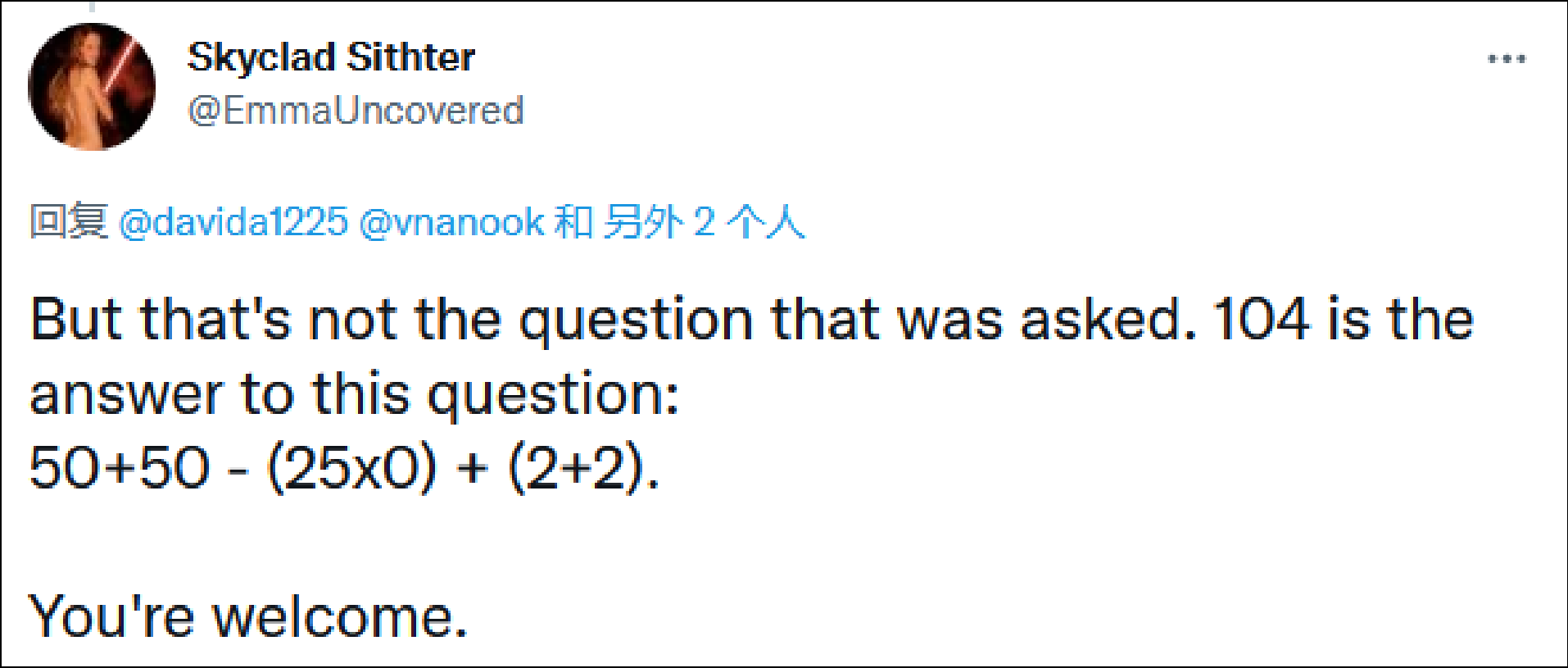 “50+50-(25×0)+(2+2)这道题的答案才是104,但这道题可不是原推文的那道题,不用谢!”