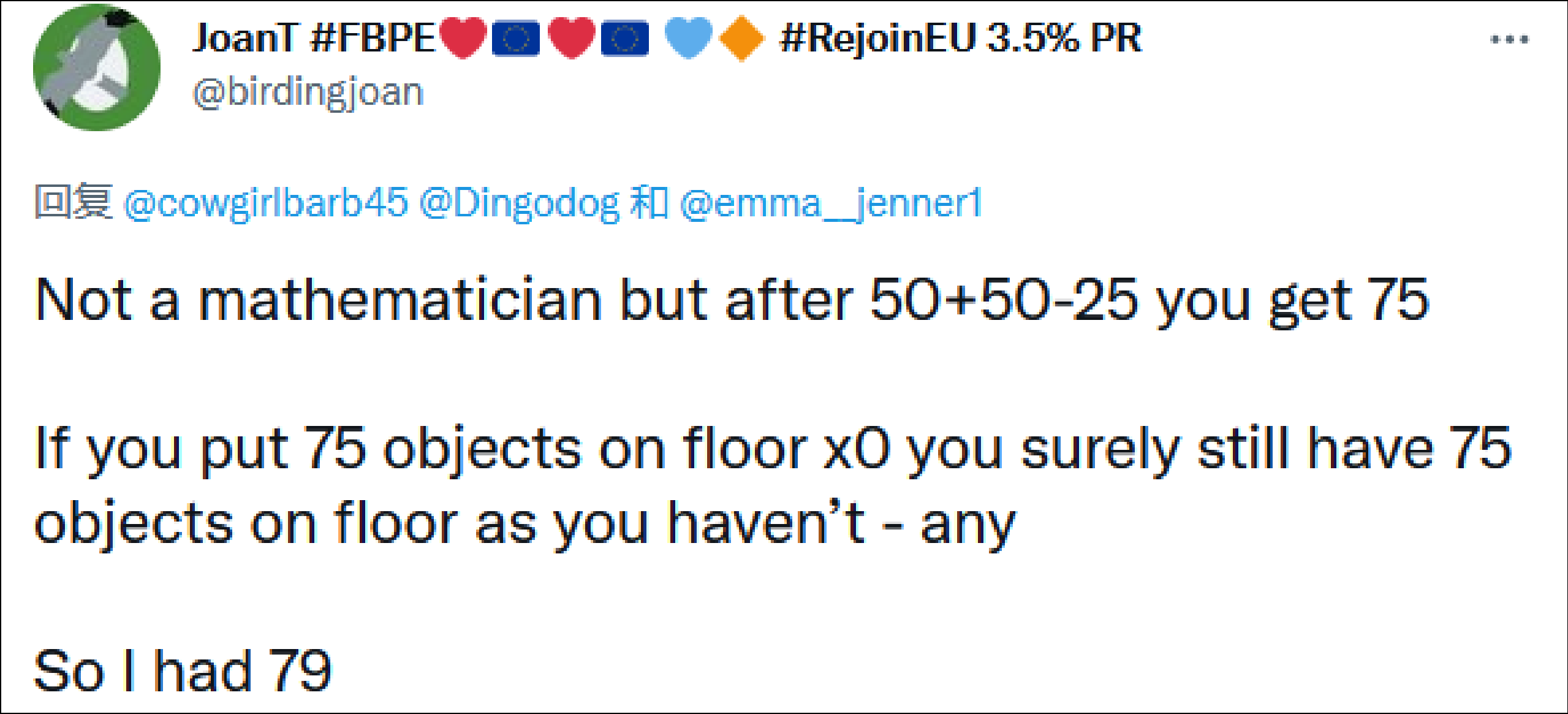 和他情况一样的人也不在少数,而且对75×0=75的结论振振有词。 “我不是数学家,但我也知道50+50-25之后是75。如果你把75个物件放在一个×0的地板上,你依旧拥有75个物件在地板上……所以我的答案是79。”