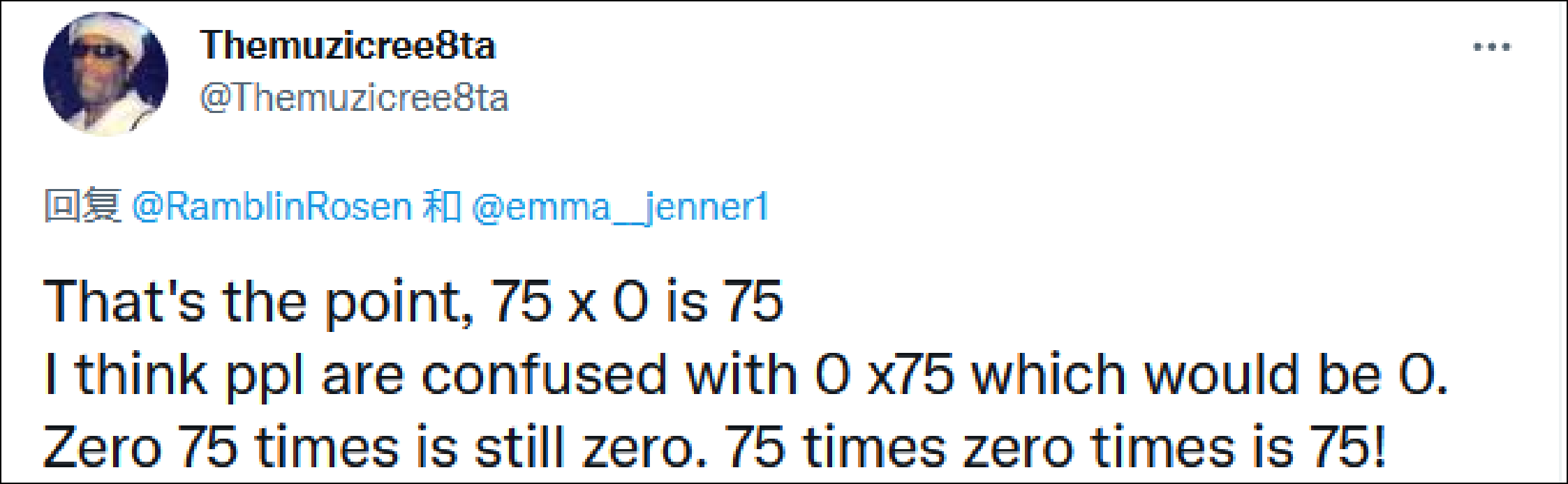 “重点在于,75×0=75。我认为大家把这个和0×75=0搞混了,0个75次依旧是0,但75个0次依旧是75呀。”
