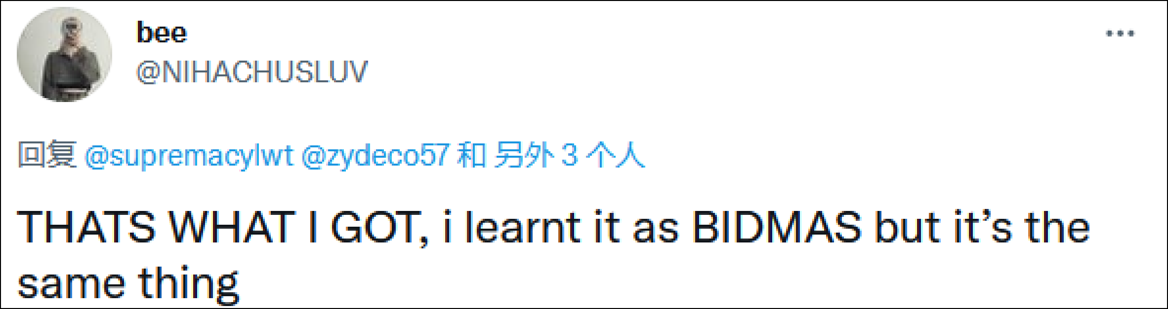很快就有人指出,这些人怕是学了个寂寞…… “唔……如果你真学了BODMAS,你不会算出4的……”