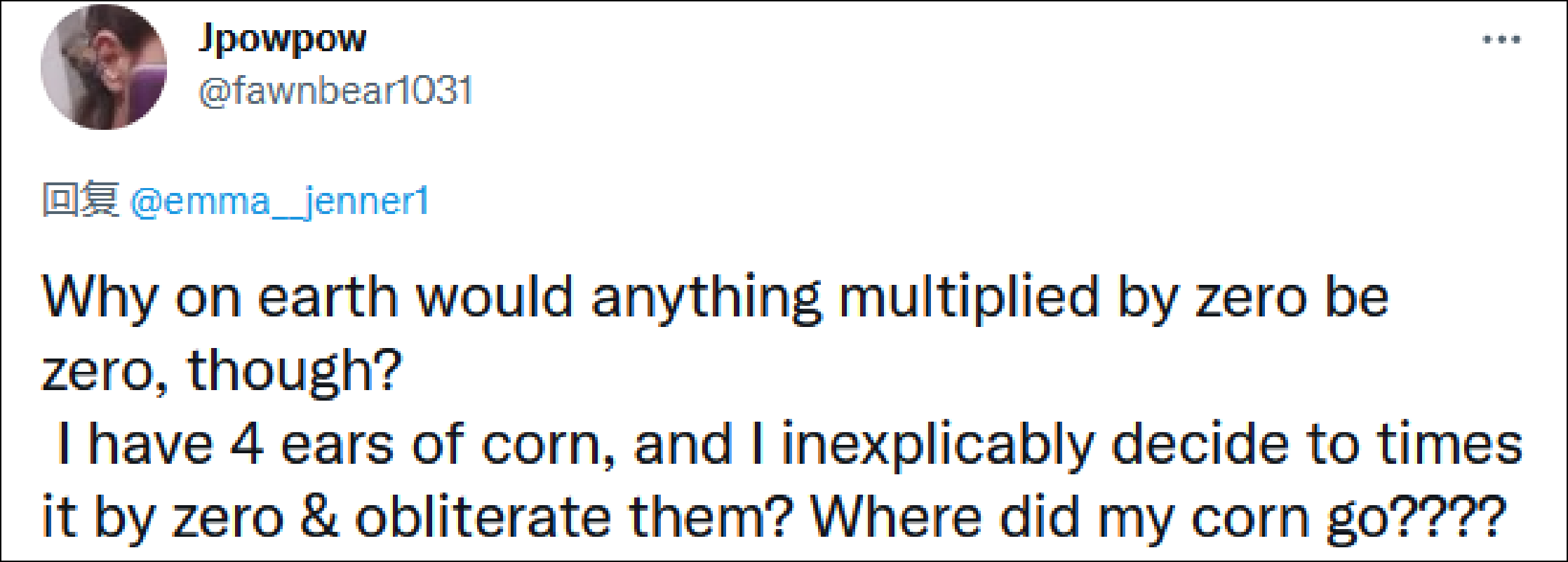 “但是,为什么任何东西乘以0都是0呢?我有4穗玉米,而我却莫名其妙地决定乘以0然后把它们消灭掉?我的玉米去哪了???”