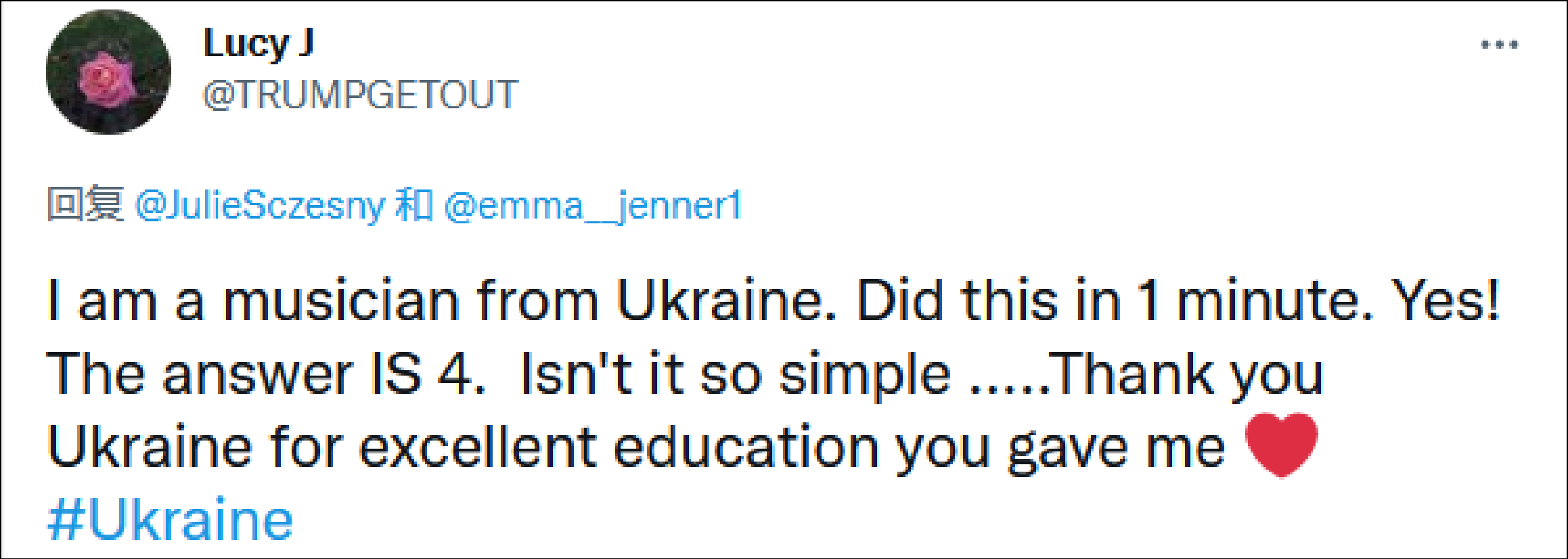 这条推文很快就引来了不少人的认同——我就说答案是4吧,赶紧点个赞! “我是来自乌克兰的音乐家,在1分钟内完成了这道题。是的!答案是4!这不是很简单吗。。。。。感谢乌克兰给我的良好教育。”