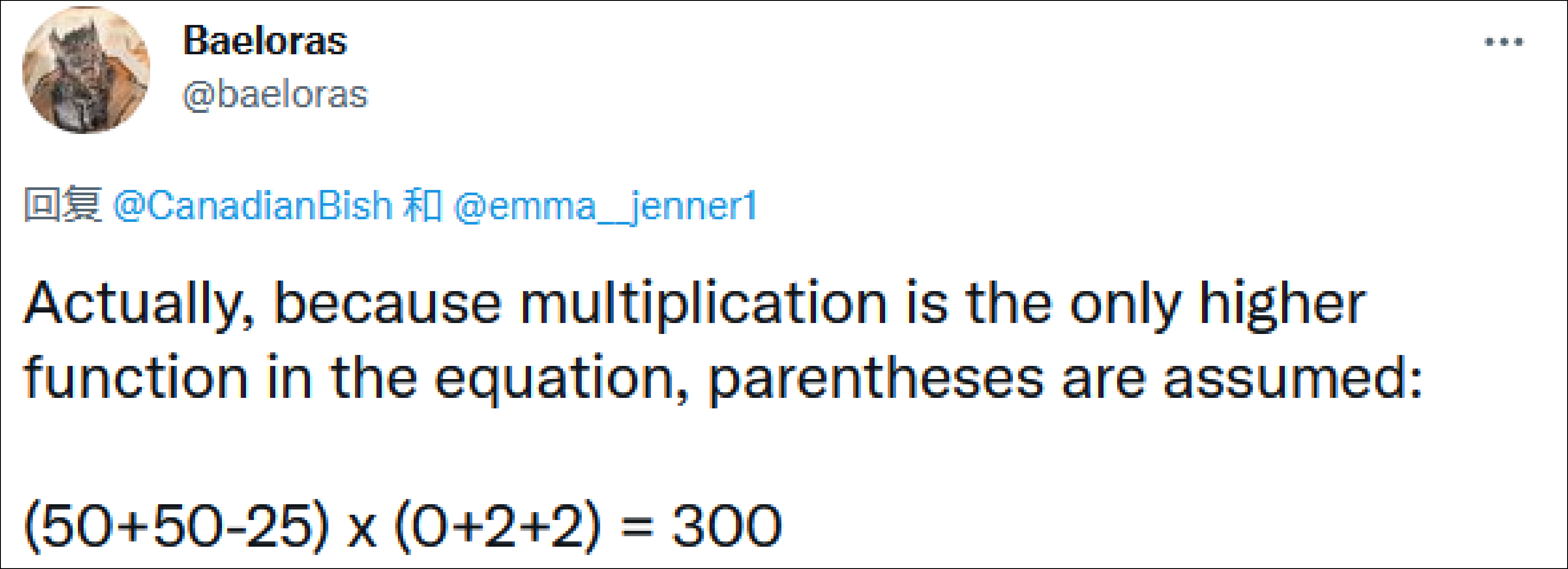 如果只是加减乘除的运算规则也就罢了,也有网友在明知该先算乘法的情况下,依旧搞错了。 “事实上,因为乘号是这个算式中唯一的‘高级函数’,所以应该给这个算式加上括号,也就是(50+50-25)×(0+2+2)=300…”
