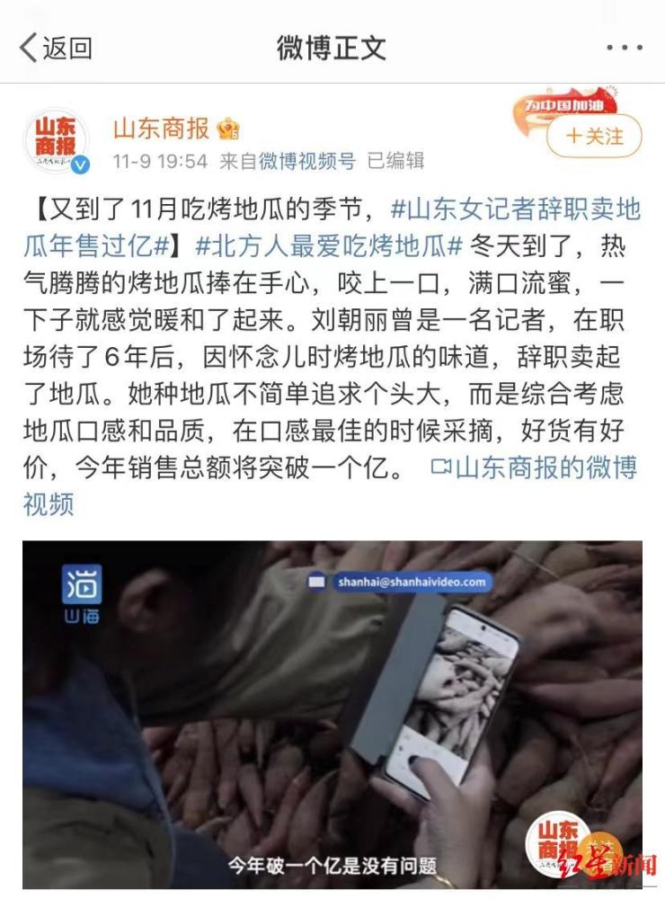 [时事新闻] 山东“记者”辞职卖地瓜年入一亿引争议 县商务局:系当地电商龙头 |