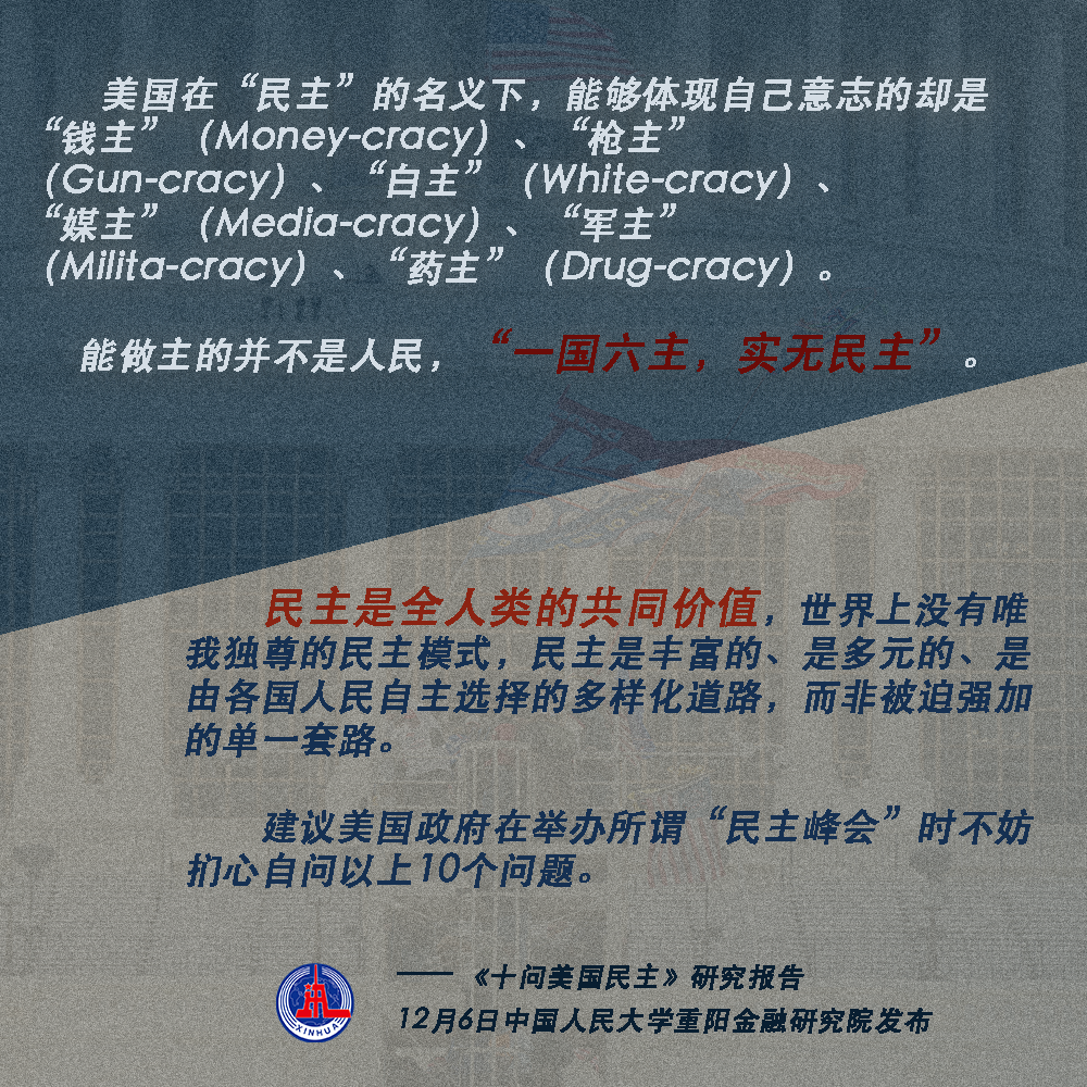 总台央视记者:12月5日,外交部网站发布了中英文版《美国民主情况》报告。请问发言人有何进一步评论? 赵立坚:民主是全人类的共同价值,是各国人民的权利,而不是哪个国家的专利。实现民主有多种形式,不可能千篇一律。用单一的标尺衡量世界丰富多彩的政治制度,用单调的眼光审视人类五彩缤纷的政治文明,这本身就是不民主的。 美国民主制度是美国一国实践的结果,具有独特性,不具普遍性。长期以来,美国自诩“民主灯塔”和“民主样板”,无视自身民主制度的结构性缺陷与实践中走样,频频打着所谓民主的旗号肆意干涉他国内政、发动对外战争,充当“民主教师爷”,在许多国家和地区制造动荡和人道主义灾难,招致国际社会广泛批评。 世界需要对美国的民主情况作出深入检视。中英文版的《美国民主情况》报告旨在通过列举事实数据和各国专家观点,全面梳理美国民主制度的弊端,深入分析美国国内民主实践的乱象和对外输出所谓民主的危害,向国际社会揭露美国民主外交的虚伪性。 美国自己也需要好好反躬自省。我们希望美国正视自身民主缺陷,完善自身民主制度,停止对外输出所谓民主的错误行为,这既有利于美国人民也有利于世界人民。没有哪一个国家可以垄断民主标准,没有哪一个国家可以把本国政治制度强加于人,更不能把民主当做打压别国的工具。 世界上没有哪一套民主制度是完美的,不存在适用于一切国家的政治制度模式。一个国家是不是民主,应该由这个国家的人民来评判,而不是由外部少数人来指手画脚。 各国民主制度的建立和民主进程的发展都有其历史性和民族性,都有自身独特价值。国际社会应在相互尊重、平等相待的基础上就民主问题进行交流对话,共同为全人类进步作出更大贡献。