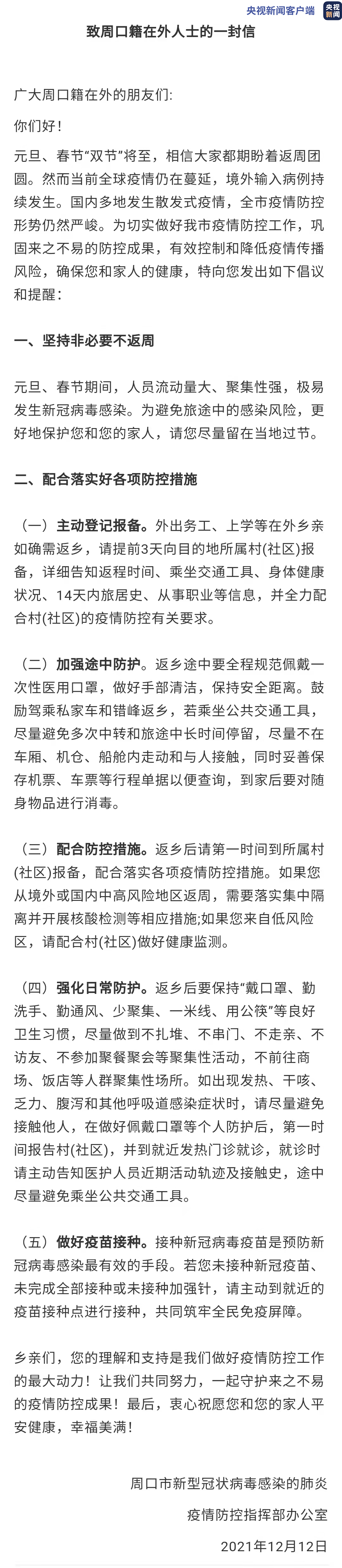 当前,全球新冠肺炎疫情正处于加速上升态势,国内多地出现零星病例和聚集性疫情。2022年春节即将到来,人员流动、聚集剧增,疫情防控形势更加严峻复杂。为切实管好“城门”、守住“院门”、看好“家门”,保障人民群众的身体健康和生命安全,根据上级要求并结合我区实际,通知如下: 一、全区党政机关、事业单位和国有企业干部职工要率先垂范,一律在本地过年,一律不出境,不前往中高风险地区,尽量不离开当地,确有需要的要严格审批管理。 二、全区各级干部职工和广大群众对计划从中高风险地区及境外来张返张的亲友,要劝导其暂时不来张返张,减少人员流动带来的疫情传播风险。 三、全区各职能部门要紧密结合群众居家防疫期间需求,切实加大水电气讯暖保障力度,进一步提升米面油和菜肉蛋奶果等生活必需品及防疫物资、药品供应能力,保障市场供应充足且价格稳定。 张家口经开区应对新型冠状病毒肺炎 疫情工作领导小组办公室 2021年12月9日