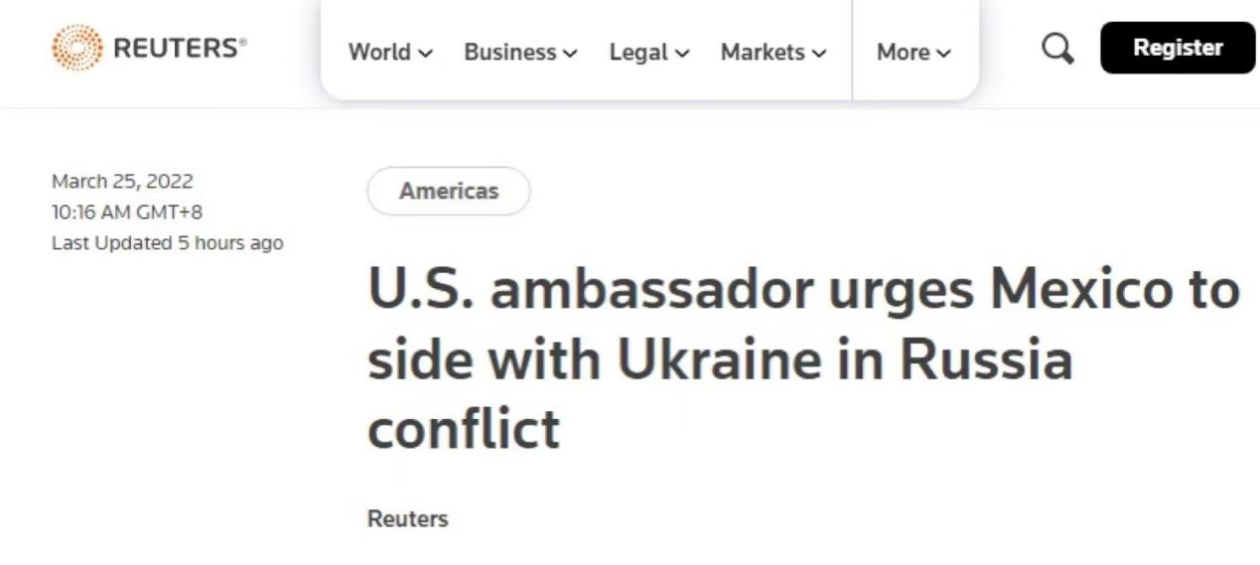 据报道,萨拉查24日在墨西哥国会下议院发表讲话时说,“就俄罗斯和墨西哥的关系如何密切,俄罗斯大使昨天发出很多噪音。抱歉,这永远不会发生。这永远不会发生。” 萨拉查声称“我们必须声援乌克兰,反对俄罗斯”,并随后提到了二战的历史说,“我清楚地记得,在第二次世界大战期间,墨西哥和美国之间没有距离,两国都团结一致反对希特勒的所作所为。”