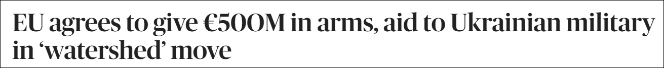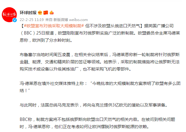 欧盟外交政策负责人博雷利描述称,“又一条禁忌消失了,即欧盟不为战争提供武器,可是的,我们正在做这件事……这场战争需要我们的介入,以支持乌克兰军队。” 据他介绍,欧盟已经同意“向乌克兰军队提供价值4.5亿欧元的武器支持,且是致命性武器、致命性援助,以及5000万欧元的非致命供应,例如燃料和保护装备。” 一名外交官表示,这一金额相当于“欧洲和平基金”2021-2027年预算周期50亿欧元的10%,“几乎是我们今年能花的全部”。 这项计划是在27日晚欧盟国家外长紧急视频会议上达成的。欧盟委员会主席冯德莱恩在媒体见面会上称,“有史以来第一次,欧盟将拨款为一个受袭击国家购买、运送武器和其他装备。这是一个分水岭。” 计划宣布的前一天,德国政府已经表示将向乌克兰提供致命武器。报道同样描述称,这是一个长期禁止向冲突地区输送此类武器国家的“历史性转变”。 冯德莱恩和博雷利还表示,该提案还将巩固欧盟此前宣布的一揽子措施,后者旨在通过对俄罗斯实施更多金融制裁,比如将“选定的俄罗斯银行”从环球银行金融电信协会(SWIFT)国际结算系统中移除,来加强对乌克兰的国际支持。 此外,在大多数欧盟国家对俄罗斯飞机关闭领空之后,欧盟也着手采取类似行动。