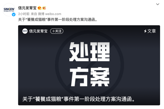 信元发育宝在声明中表示,目前已下架并暂停该产品的销售,碍于疫情原因,未能及时给予回复;目前已将关联产品回样进行收集,送至具有资质的第三方检测机构进行监测,并联系国内兽医高校与多家猫科诊疗权威机构和专家,寻求造成此次事件的真实原因。此外,对于已经购买相关产品的客户,信元发育宝称如有疑虑,可联系售后客服,无条件退款或者更换其他产品。 4月11日、4月12日,信元发育宝又接连发布与宠物主治医师、宠物主关于诊疗方案的沟通的两篇长文,就猫发病原因、临床症状、检查结果、初步诊断意见及治疗方案等内容进行了介绍,同时希望获得更多、更新的完整病例,以便进一步提出治疗评估方案。 时隔一日,信元发育宝再次发声,对外公布该事件第一阶段处理方案沟通函。信元发育宝表示,目前仍未找到造成此次事件的原因,发病机制及造成原因仍不明晰,并强调目前第一要务是救治猫。 据信元发育宝介绍,事发之后,品牌便与大型诊疗机构于4月12日建立联系,目前在此收治的案例,将在专家评估治疗方案后,由紧急救治应急基金承担后续的治疗费用。 4月14日,信元发育宝表示,经第三方权威机构检测,重金属、霉菌毒素、农药残留、细菌等国家规定的相关标准,均属合格。为了解除消费者的疑虑,虽然产品检测合格,仍将主动展开无条件并扩大回收相关系列产品。对于还在救治和离世的猫,信元称将承担猫咪费用、医疗费用、丧葬费等费用。